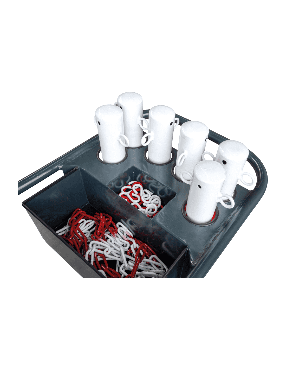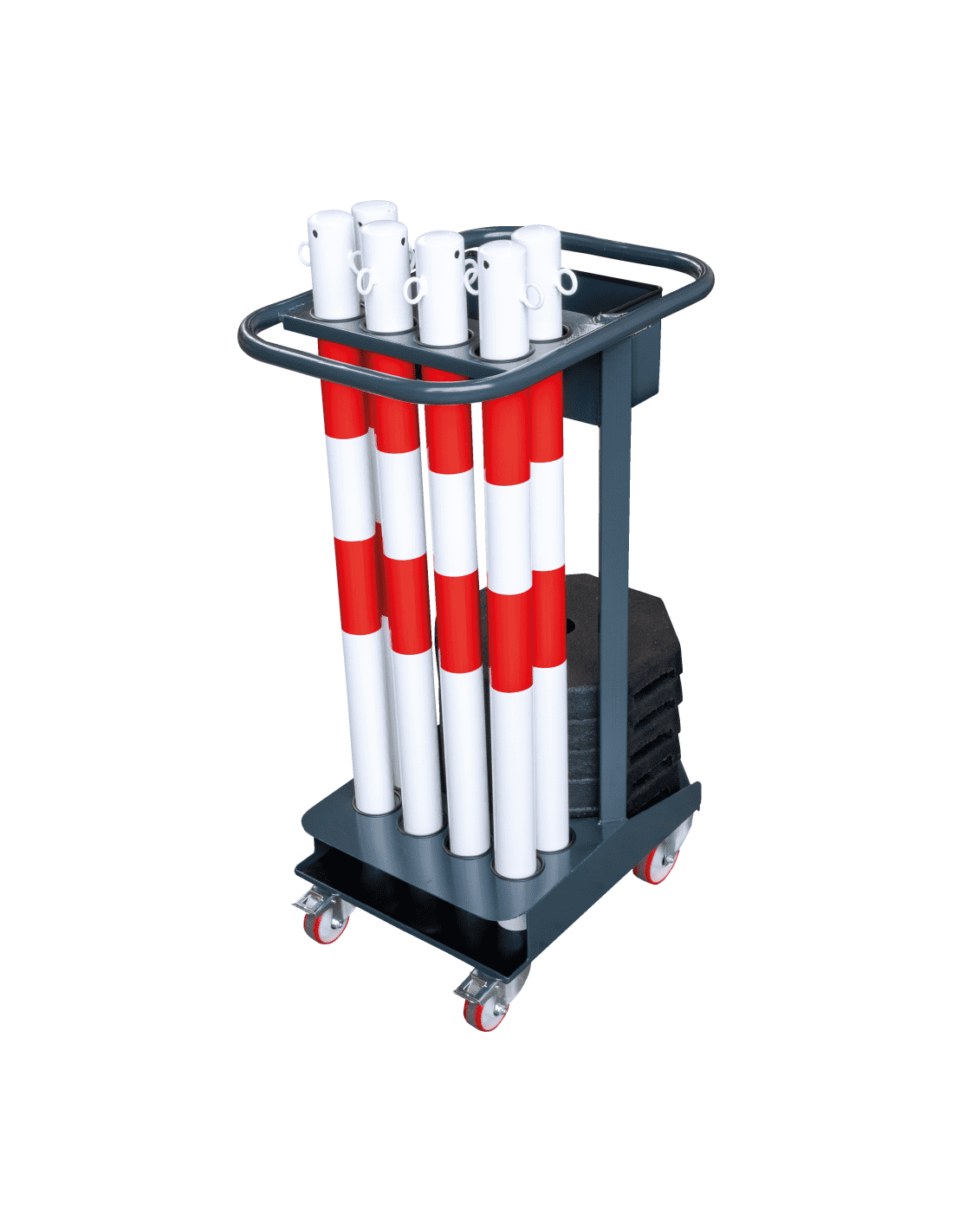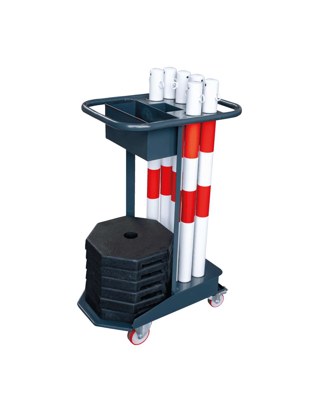 Belangrijkste kenmerken trolley met set kunststof afzetpalen, rood wit