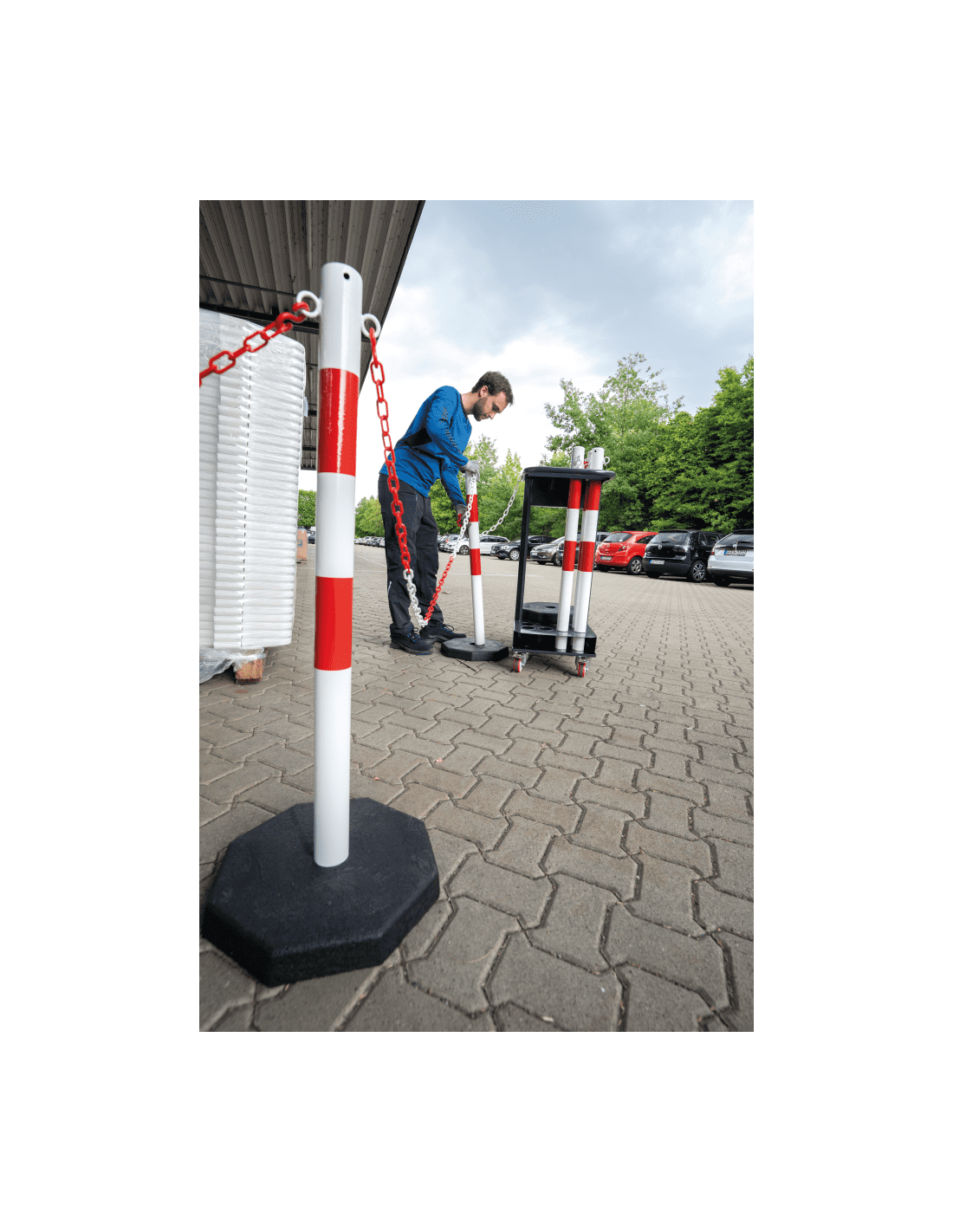 Belangrijkste kenmerken trolley met set stalen afzetpalen, rood wit