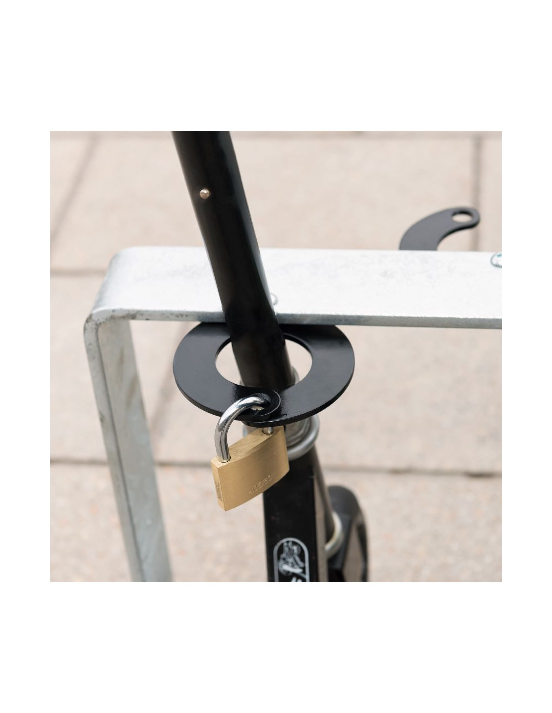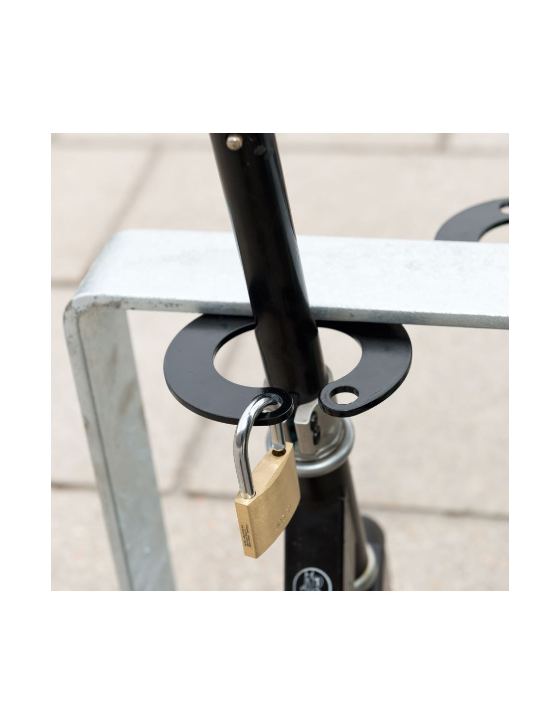 Met deze stalling kunt je jouw steps veilig parkeren aan beide zijden. De steps kunnen eenvoudig worden beveiligd met behulp van een hangslot of kabelslot op de klemmen. Houd er rekening mee dat het slot niet wordt meegeleverd met de stalling.