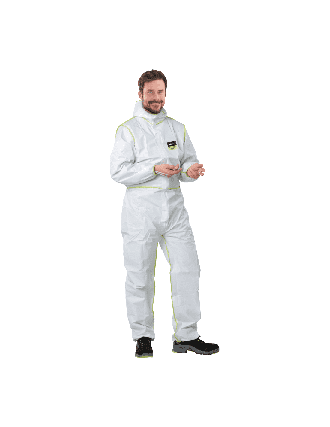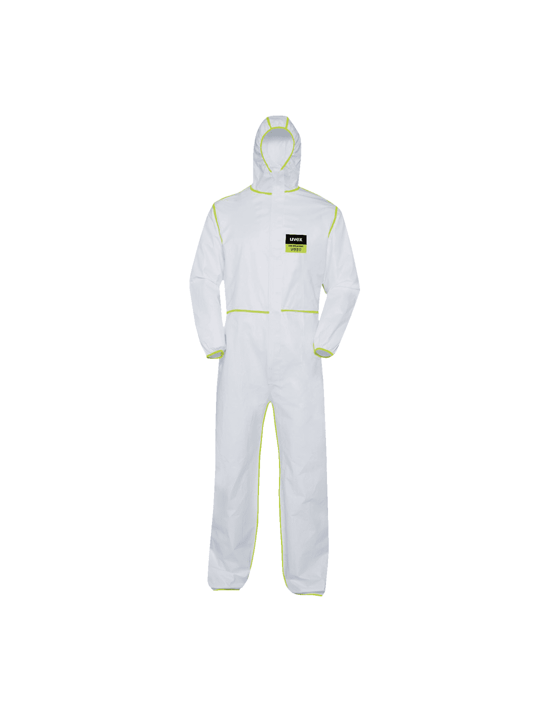 De Uvex 9877 chemisch bestendige wegwerpoverall biedt betrouwbare bescherming tegen vloeistofspatten en deeltjes. Dankzij de gebonden naden en elastische taille geniet je van een hoog beschermingsniveau zonder in te leveren op comfort. Met een handige tweewegritssluiting en ademende eigenschappen is deze overall perfect voor cleanroomomgevingen. De opvallende kleurencombinatie van wit en lime zorgt voor goede zichtbaarheid, terwijl het materiaal met spingebonden en PE-laminaat een duurzame bescherming biedt.