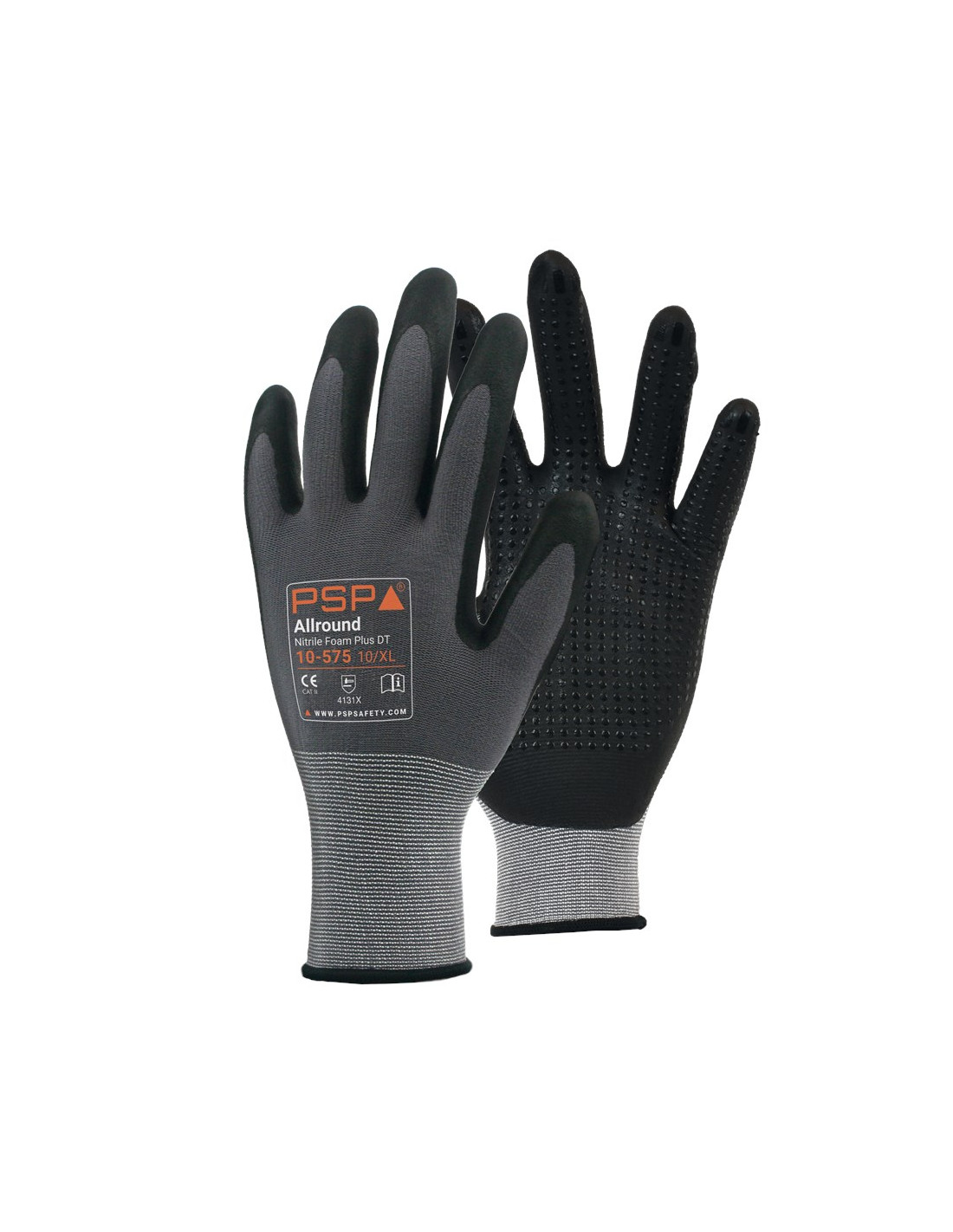 De PSP Allround Nitrile Foam Plus DT 10-575 is een handschoen met een 15G nylon liner bedekt met een ademende nitril foam coating met antislip PVC noppen op de palm voor extra grip. Op de rug en vingers is de handschoen opengewerkt, wat zorgt voor goede ventilatie en daardoor een uitstekend draagcomfort. De open nitril coating zorgt voor een goede grip op droge, natte en olie-achtige ondergronden. Artikel PSP 10-575 is getest en gecertificeerd conform de Europese Verordening (EU) 2016/425 en de EN-normen EN420 / EN388:2016.