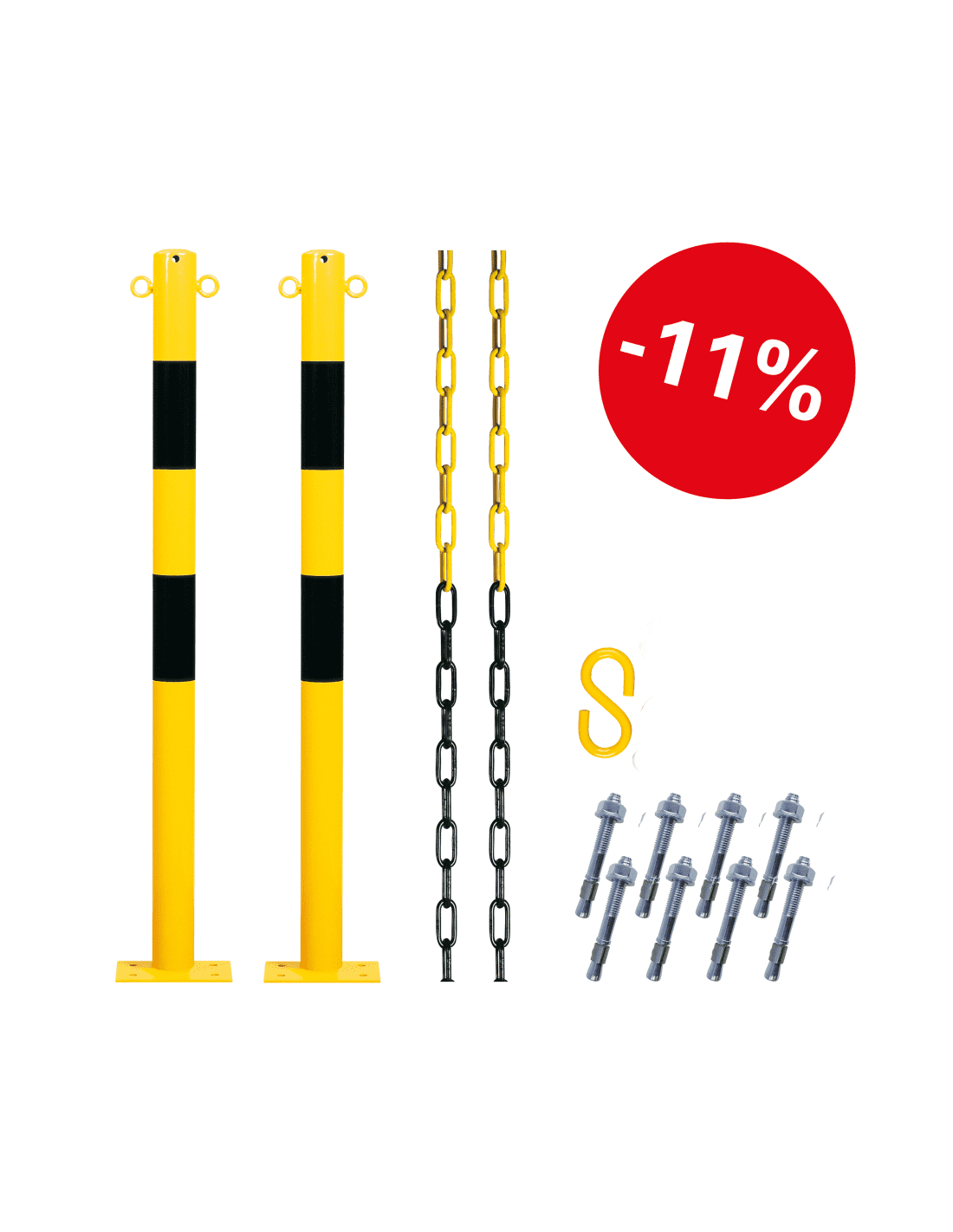 De rampaal voordeelset Duo is geschikt om binnen- en buitenruimtes af te schermen. Op die manier kunt u ervoor zorgen dat uw gebouwen en ruimtes beschermd zijn tegen aanrijdingen. Deze set bestaat uit: 2 beschermpalen met 2 kettingogen, 2 meter afzetketting, 20 S-haken en 4 ankers.