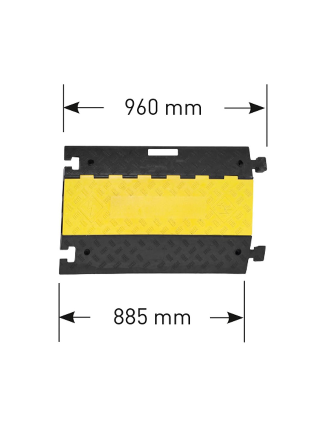 Dankzij de robuuste constructie is deze kabelbrug bestand tegen auto- en vrachtwagenverkeer met een aslast tot 12 ton. De kabelbrug is uitgerust met 3 kanalen, waardoor je meerdere kabels veilig kunt geleiden. De afmetingen van de kabelbrug zijn 960 x 600 x 75 mm, terwijl de kabelkanalen variëren in afmetingen: 2 kanalen met afmetingen van 68 x 50 mm en 1 kanaal van 55 x 50 mm.