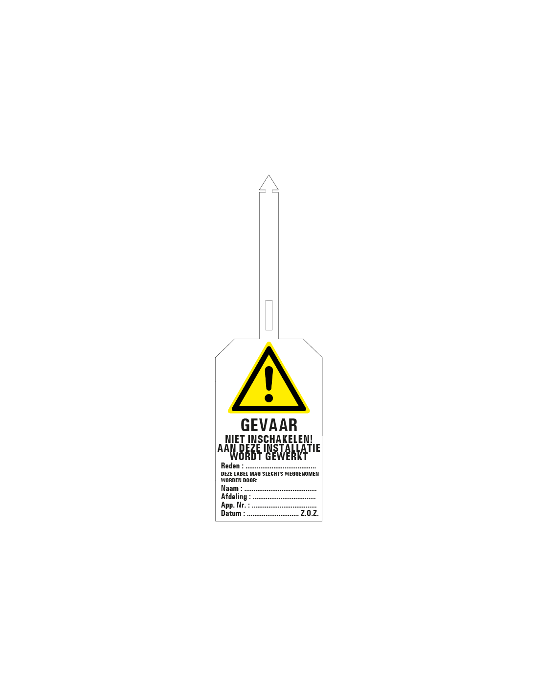 De waarschuwingstag is voorzien met de tekst 'Gevaar, niet inschakelen! De tag is gemaakt van PVC dat 0,3mm dik is en is niet te scheuren. De tag is beschrijf baar met een viltstift. Bevestiging van de tag kunt u doen door een gat <Ø33mm.