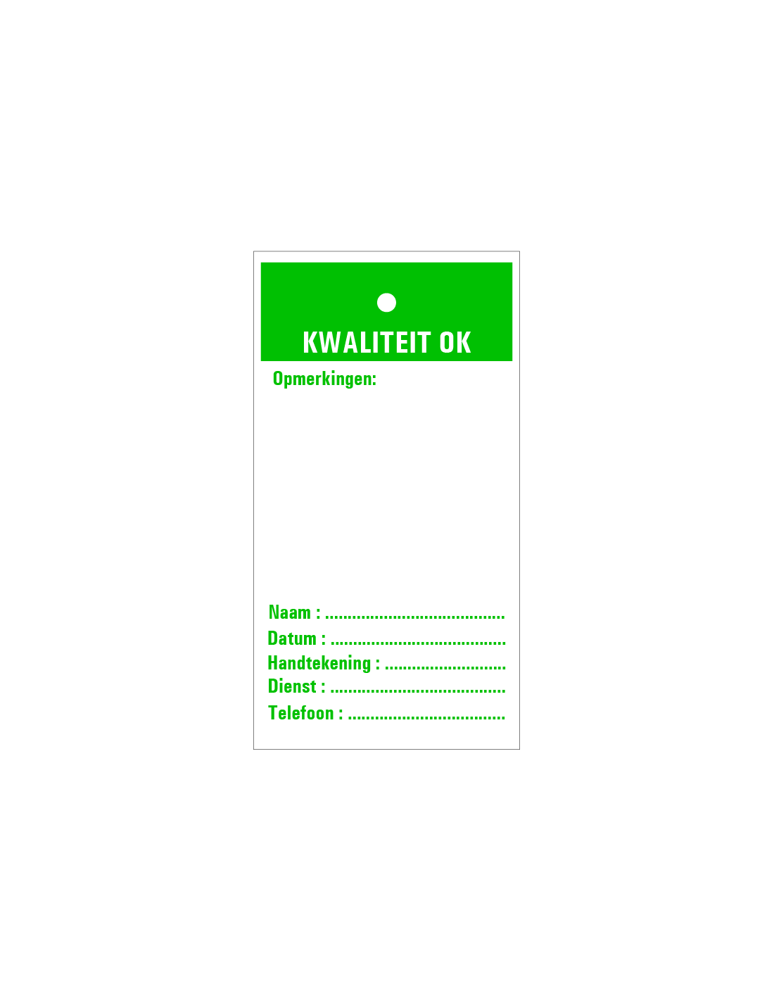 Een inspectietag is ervoor om op te hangen aan bijvoorbeeld machines. Met de verschillende tags kunt u duidelijk aangeven wat de status van de machine is zodat uw werknemers hiervan op de hoogte zijn.