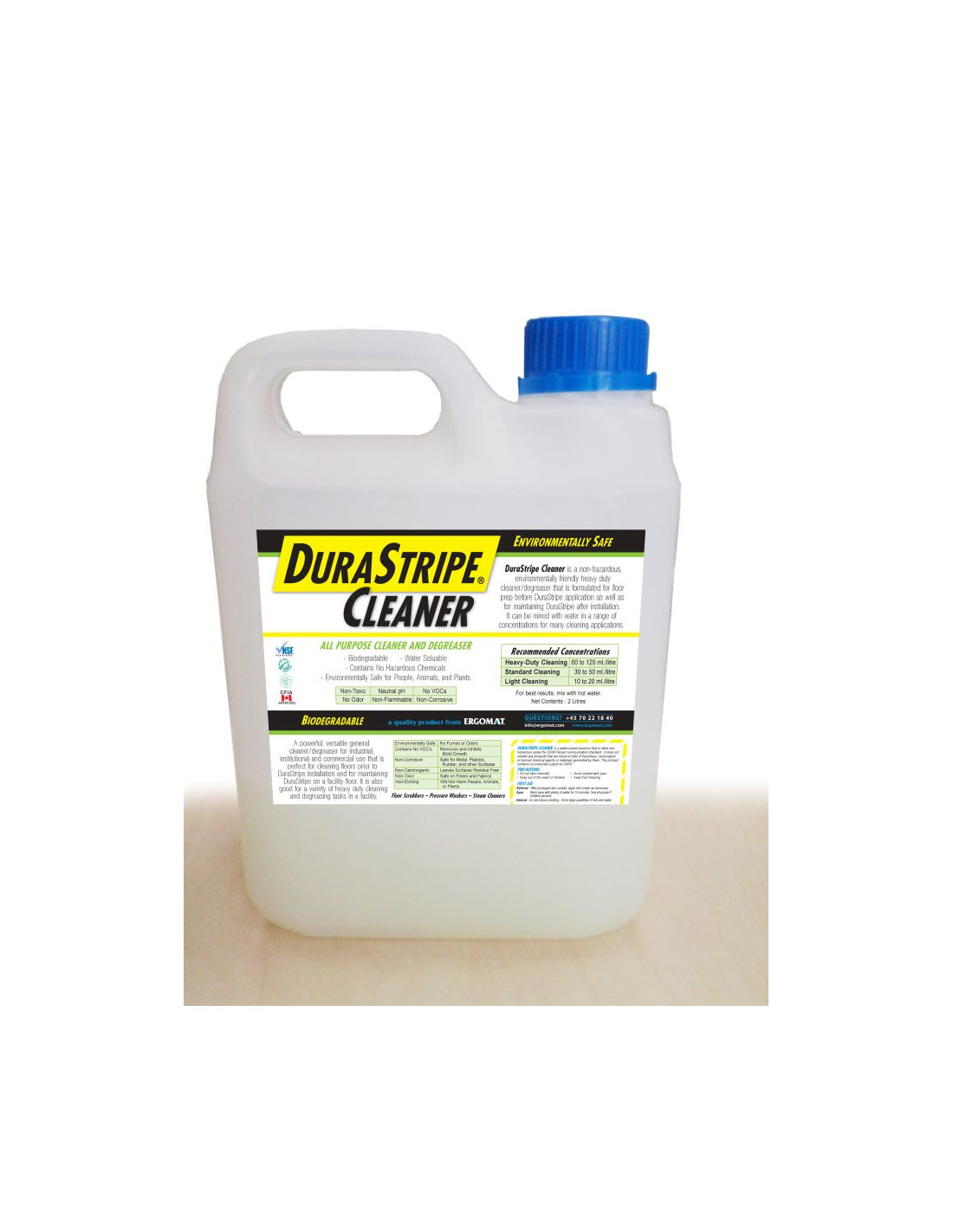 Deze gepatenteerde Durastripe®-reiniger is een ongevaarlijke, milieuvriendelijke en veelzijdige reinigingsconcentraat dat is geformuleerd voor een schone, residuvrije vloervoorbereiding voor DuraStripe-toepassing. Daarnaast kan het gebruikt worden om de Durastripe-producten te onderhouden na installatie. Het kan ook worden gemengd met water in verschillende concentraties voor vele andere reinigingsmiddelen.