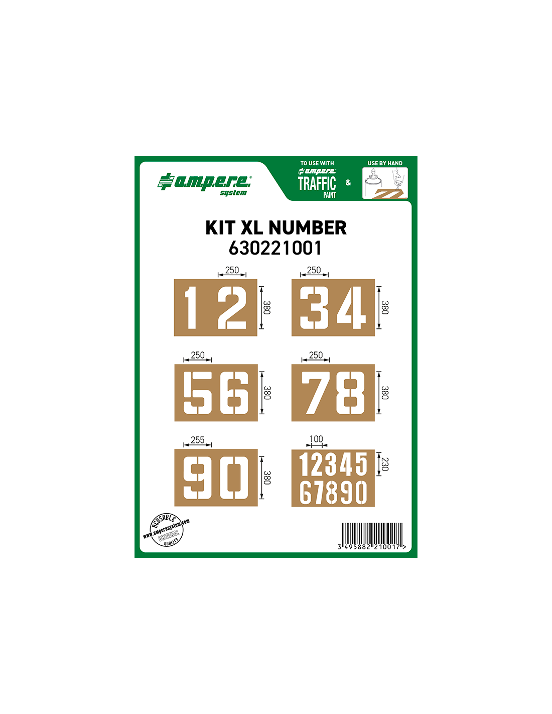De Ampere Traffic spuitsjablonen set cijfers is een complete set van 6 herbruikbare spuitsjablonen van het merk A.M.P.E.R.E. System. Hiermee kun je eenvoudig nummers van 0 tot 9 markeren. Gemaakt van duurzaam en speciaal versterkt geolied karton, biedt deze set een kosteneffectieve en snelle oplossing voor het identificeren van parkeerplaatsen en het markeren van nummers in verschillende omgevingen, zoals magazijnen, werkplaatsen en fabrieken.