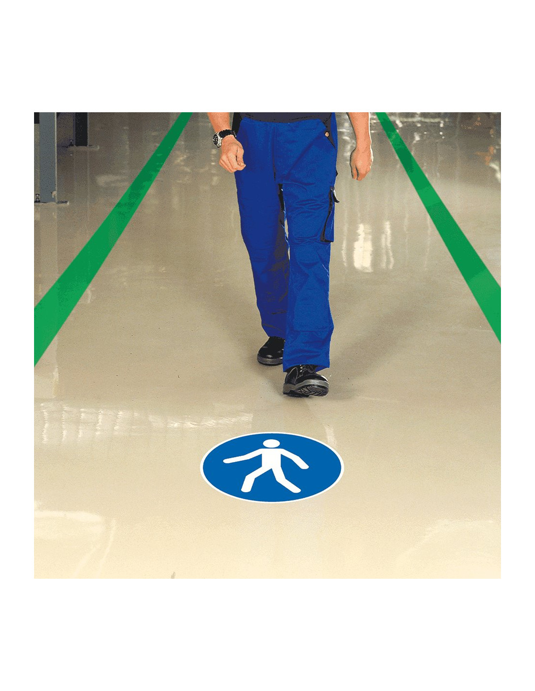 Deze vloersticker laat door middel van het symbool van een voetganger zien dat er hier sprake is van een verplicht voetpad. Op die manier zorg je ervoor dat mensen ervan op de hoogte zijn dat ze hier moeten lopen.