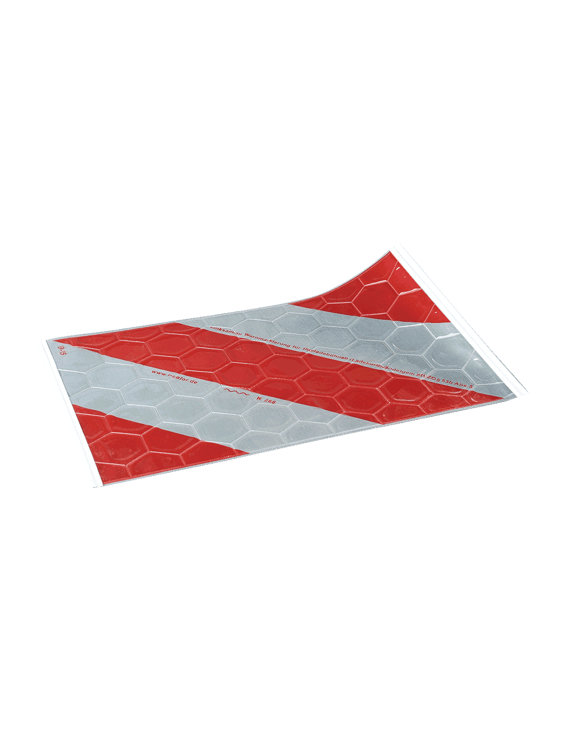 De vlag heeft een opvallend reflecterend rood-wit kleurenschema, waardoor hij zelfs in donkere omstandigheden goed zichtbaar is. Het materiaal is gemaakt van hoogwaardig zeildoek met reflecterende folie, wat zorgt voor duurzaamheid en een lange levensduur.