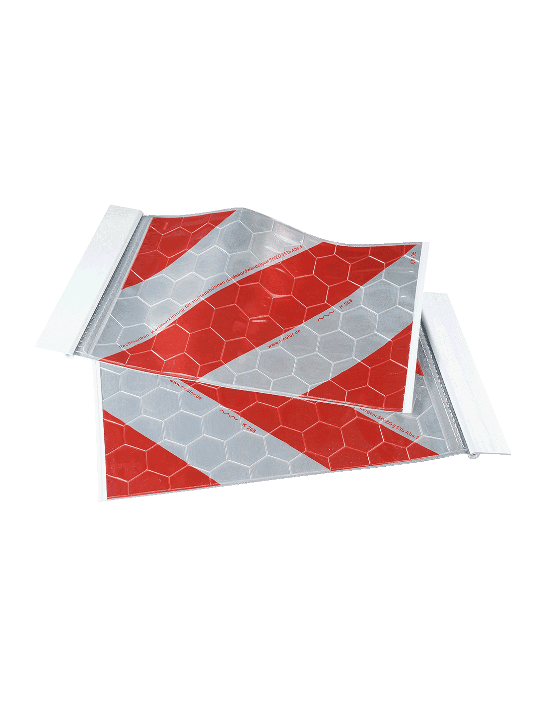 De reflecterende laadklepvlaggen worden geleverd in een variant met strepen naar links en een variant met strepen naar rechts. Daarnaast ontvang je er houders bij die je kunt gebruiken om de vlaggen aan de laadklep te bevestigen.