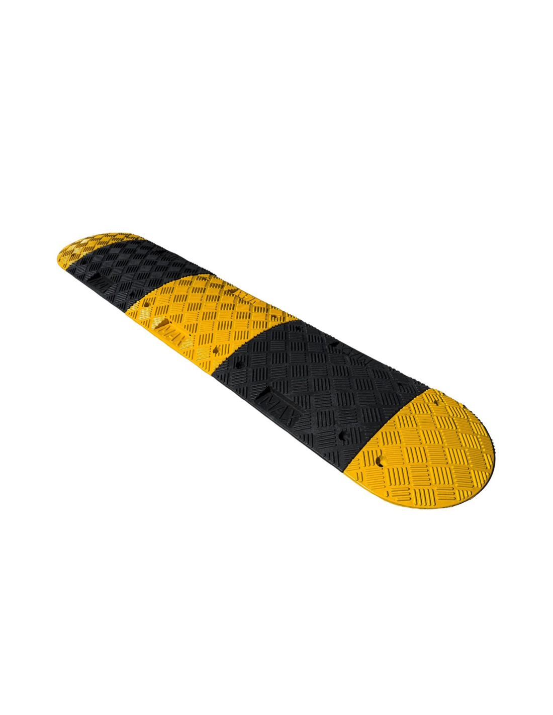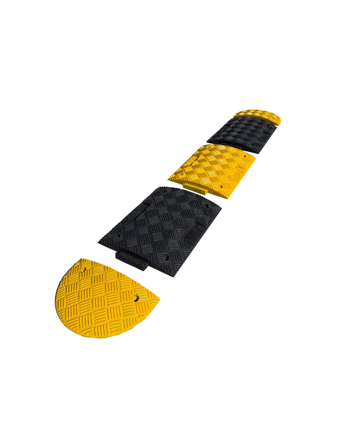 De set wordt compleet geleverd met middenstukken, eindstukken en montagemateriaal, waardoor installatie snel en eenvoudig verloopt. De verkeersdrempel is vervaardigd uit gerecycled PVC, wat hem niet alleen duurzaam en weerbestendig maakt, maar ook milieuvriendelijk. Met zijn stevige constructie en lange levensduur biedt deze drempel een betrouwbare oplossing voor permanente of tijdelijke snelheidsbeheersing.