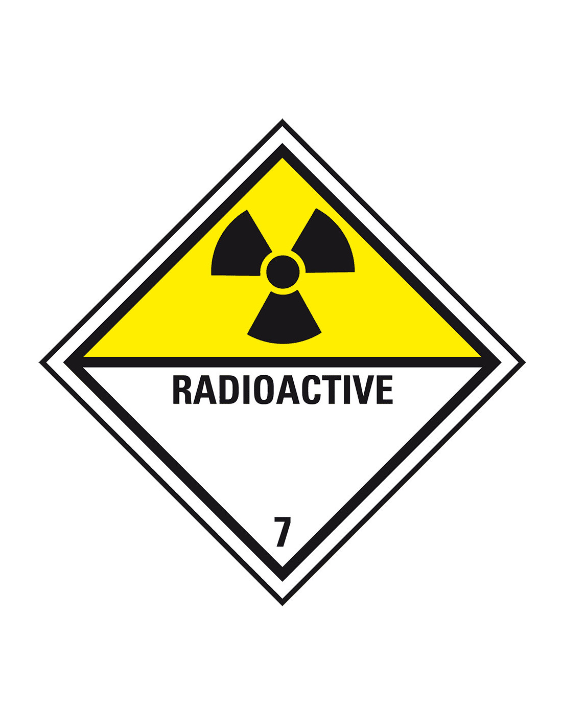 Het aluminium ADR klasse 7 bord radioactieve stoffen geeft met behulp de code 7 aan dat er hier sprake is van radioactieve stoffen. Wanneer er geen nummering op staat, bevat de stof Alfastraling.