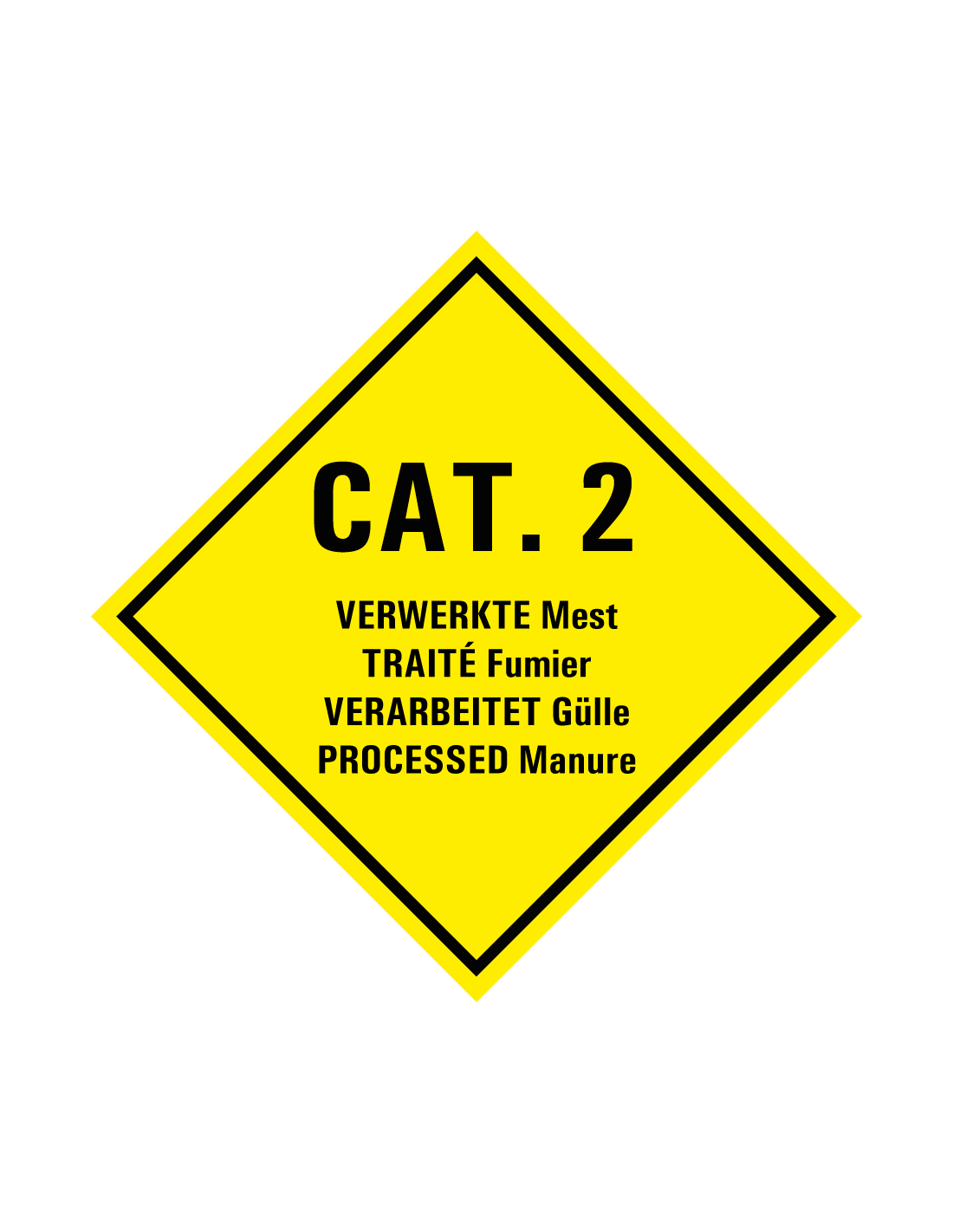 Het categorie 2 mest bord met tekst wordt met opdruk in 4 talen geproduceerd. Verder heeft het bord een geel met zwarte kleur en is het verkrijgbaar in drie verschillende afmetingen.