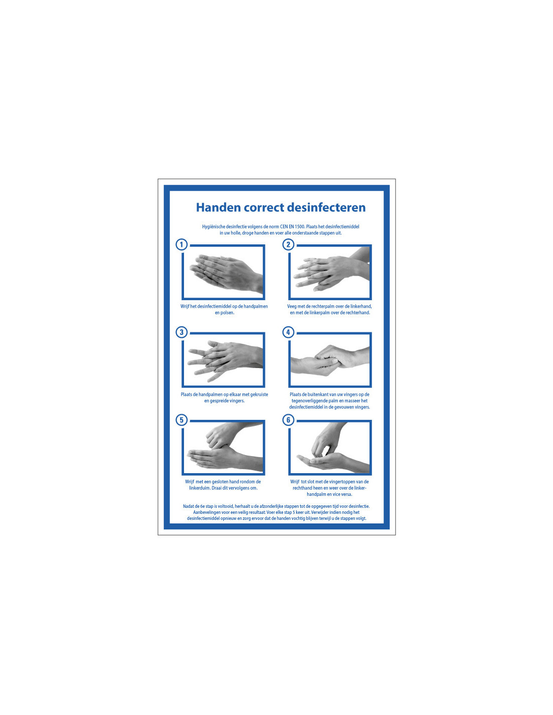 Het bord met tekst handen correct desinfecteren geeft aan dat het op de betreffende locatie gewenst is om de handen correct te desinfecteren. Via een pictogram overzicht kan het voorbeeld genomen worden.