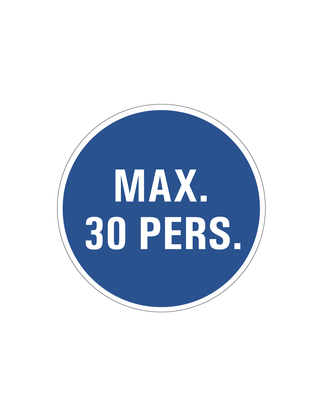 Dit maximaal 30 personen bord laat zien dat er op deze plek een verplichting geldt voor maximaal 30 personen. Het is handig om dit bord te gebruiken wanneer u bijvoorbeeld niet wilt dat er teveel mensen bij elkaar staan en zich verzamelen.