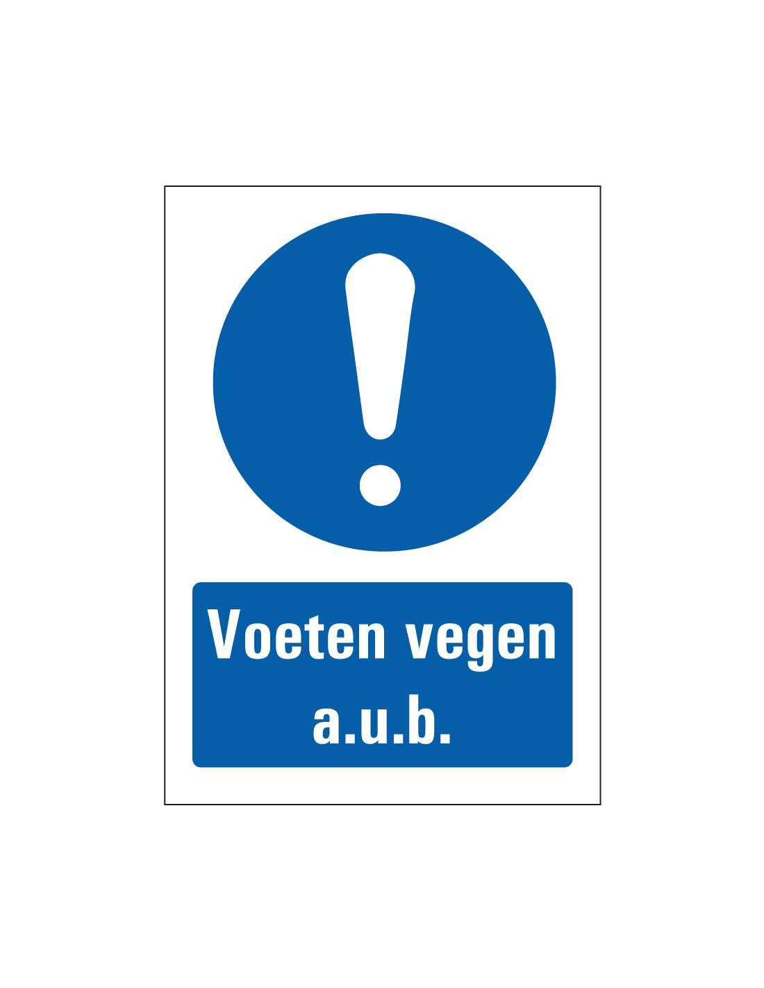 Het Voeten vegen aub bord is een rechthoekig bord met het symbool van een uitroepteken om aan te geven dat er hier sprake is van een verplichting om je voeten te vegen. Het bord is voorzien van de Nederlandse tekst "Voeten vegen aub" in witte letters op een blauwe achtergrond. Het bord is verkrijgbaar in verschillende afmetingen en is geschikt voor binnen- en buitengebruik.