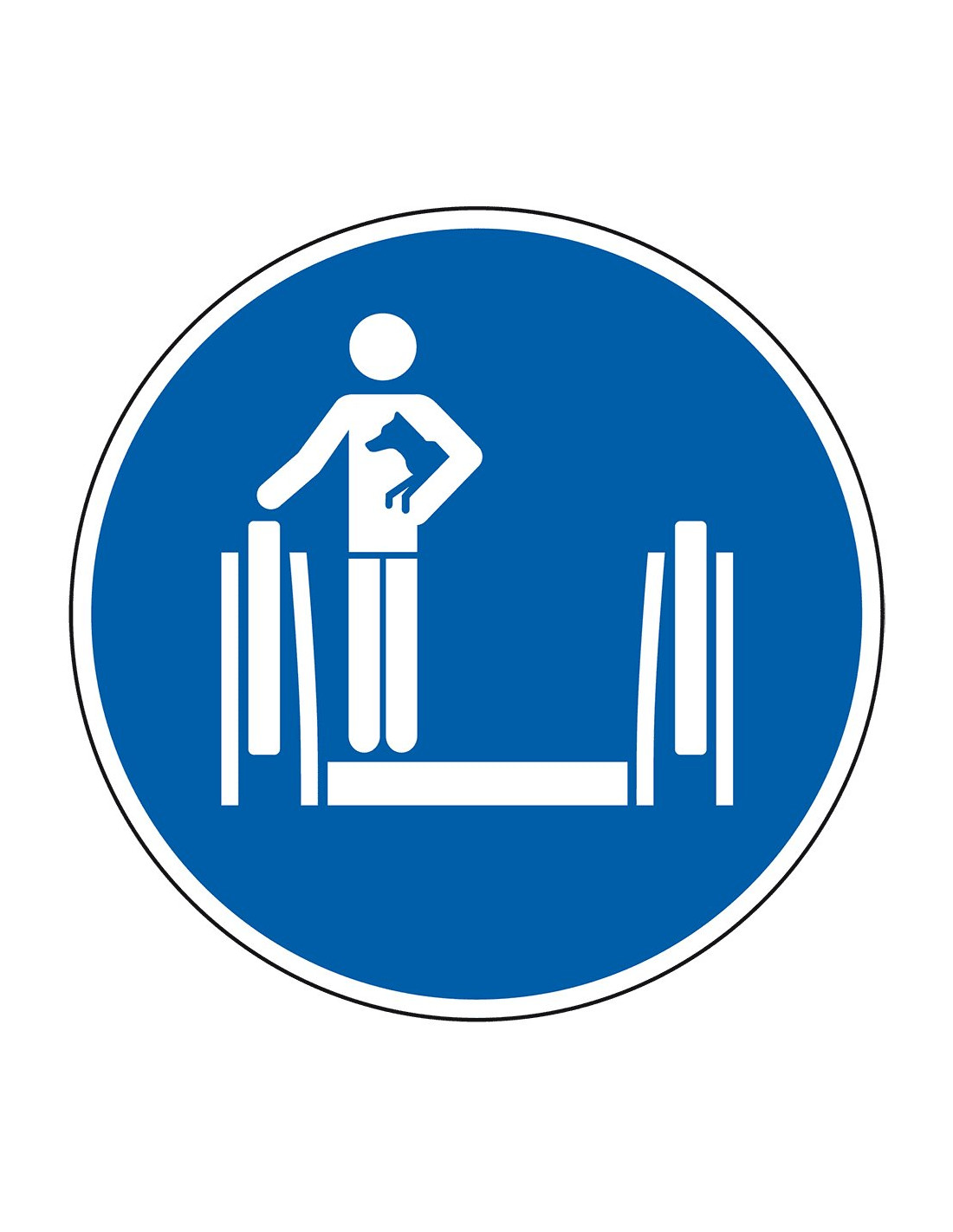 Dit honden dragen gebodsbord laat zien dat er op deze plek een bepaald gebod geldt. Het is handig om dit bord te gebruiken wanneer u wilt aangeven dat het verplicht is om de hond te dragen in een bepaald gebied. Denk aan roltrappen.