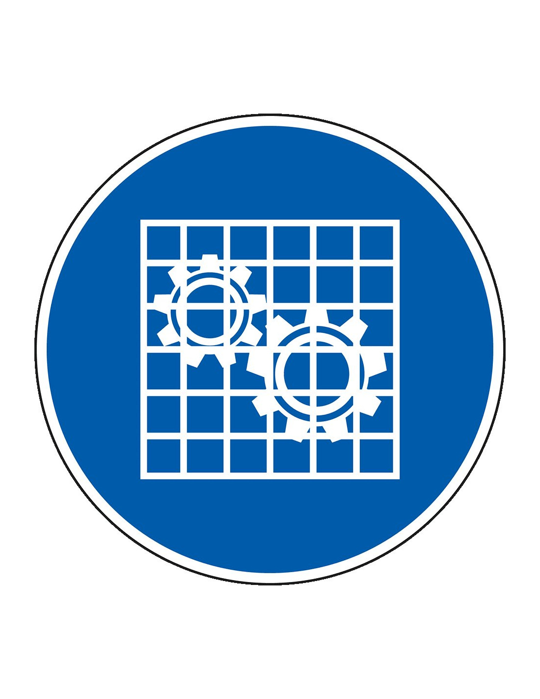 Dit gebodsbord laat zien dat er op deze plek een bepaald gebod geldt voor het controleren van de bescherming. Het is handig om dit bord te gebruiken wanneer u mensen wilt duidelijk maken dat het verplicht is om de bescherming van een bepaald apparaat te controleren.
