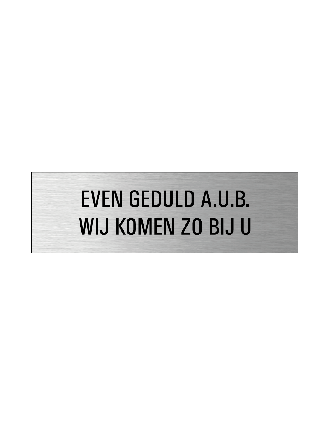 Dit stijlvolle deurbordje met Nederlandse tekst "Even geduld AUB wij komen zo bij u" is perfect voor situaties waarin bezoekers of klanten even moeten wachten. Met een afmeting van 165 x 50 mm past het discreet op de meeste deuren.