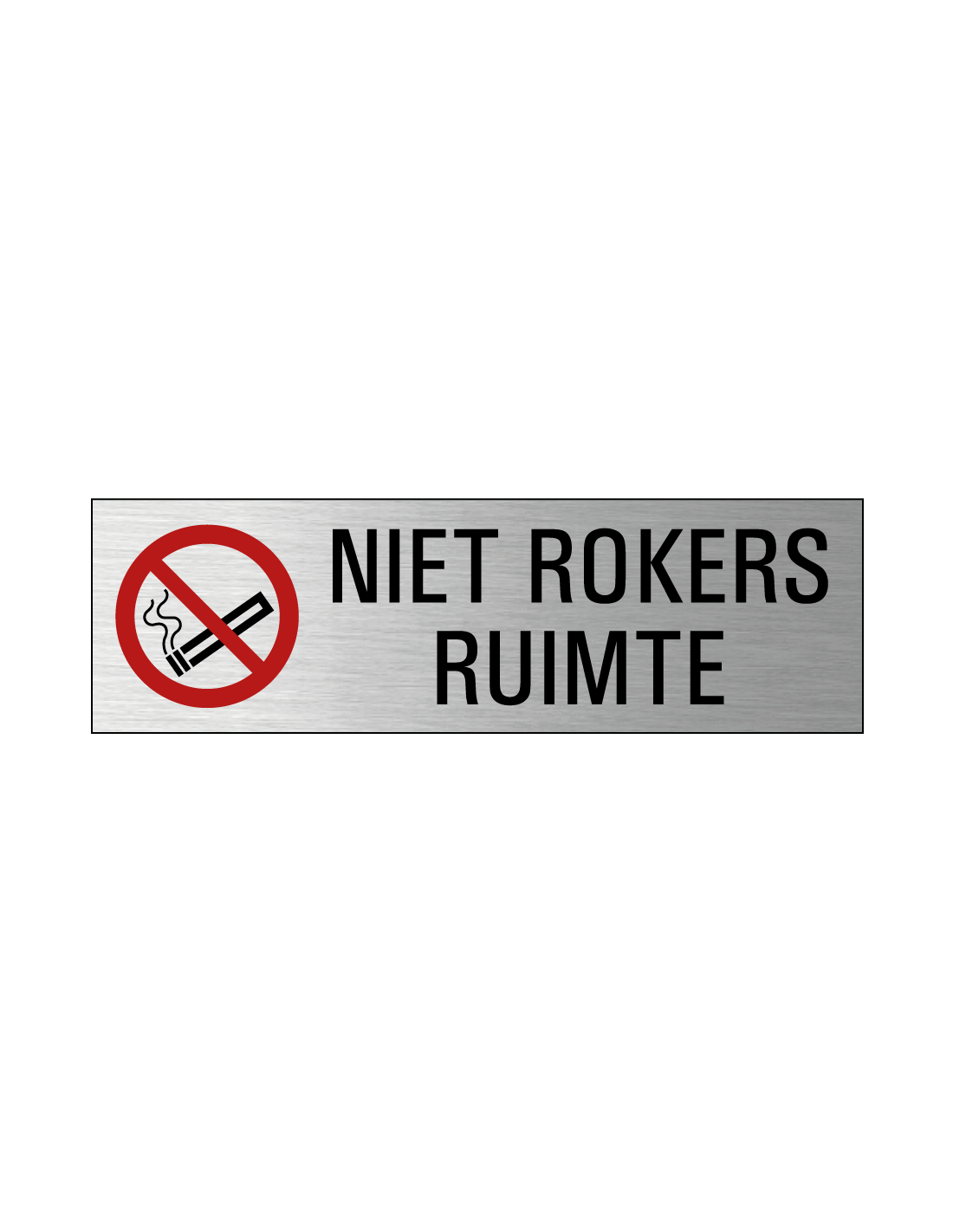 Het Niet rokers ruimte deurbordje met zelfklevende strip is gemaakt van 3 mm dik geborsteld aluminium materiaal. Dit is een stijlvol materiaal om aan te duiden dat deze ruimte voor niet rokers is.