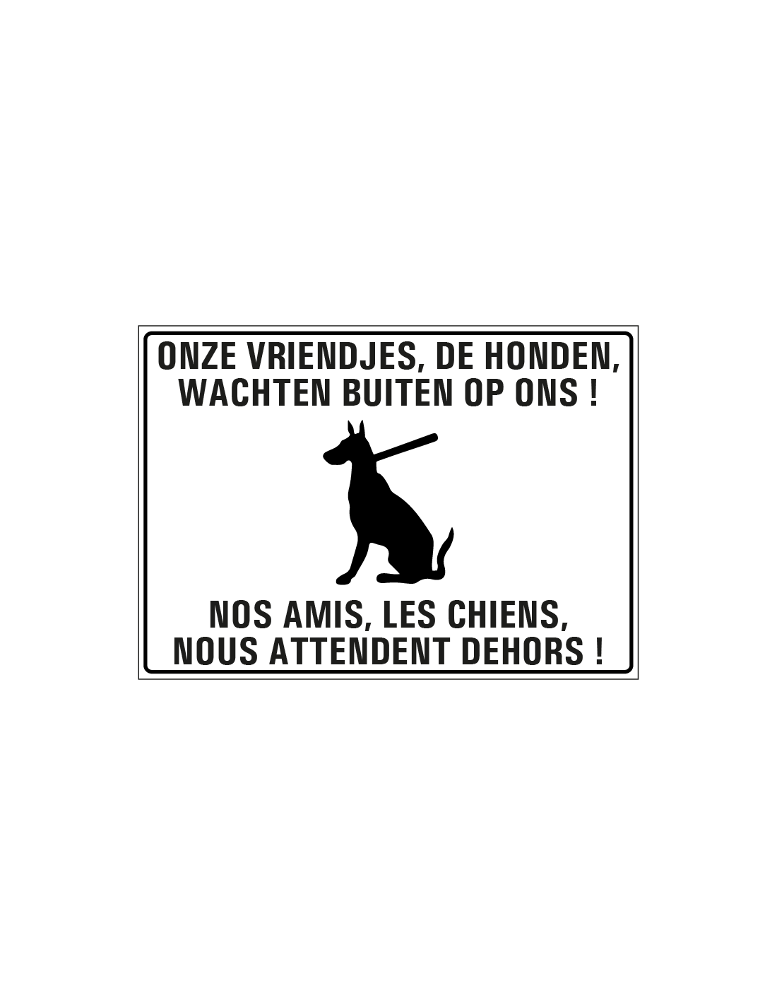 De informatiepictogram de honden wachten buiten bord, tweetalig, wit zwart geeft bepaalde informatie over hele uiteenlopende onderwerpen. De pictogrammen zijn verkrijgbaar in verschillende afmetingen en materialen. Hierdoor kunt u de pictogram kiezen die het best bij u past. De pictogrammen op ESVSHOP.nl worden over de hele wereld herkend. Ook zijn er veel informatie pictogrammen met tekst. Dit zijn over het algemeen Nederlandse, Engelse of Franse teksten.