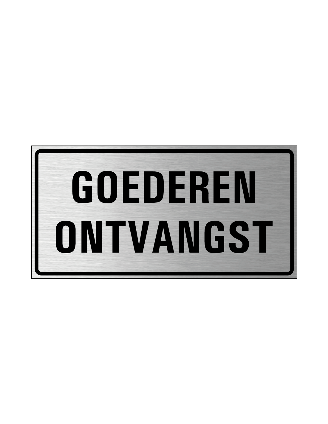 Het geborsteld aluminium goederenontvangst bord is een rechthoekig bord met de tekst goederenontvangst om aan te geven dat er op deze plek sprake is van het ontvangen van goederen. Het bord is voorzien van de Nederlandse tekst "Goederenontvangst" in zwarte letters op een grijze geborsteld aluminium achtergrond. Het bord is verkrijgbaar in verschillende afmetingen en is geschikt voor binnen- en buitengebruik.