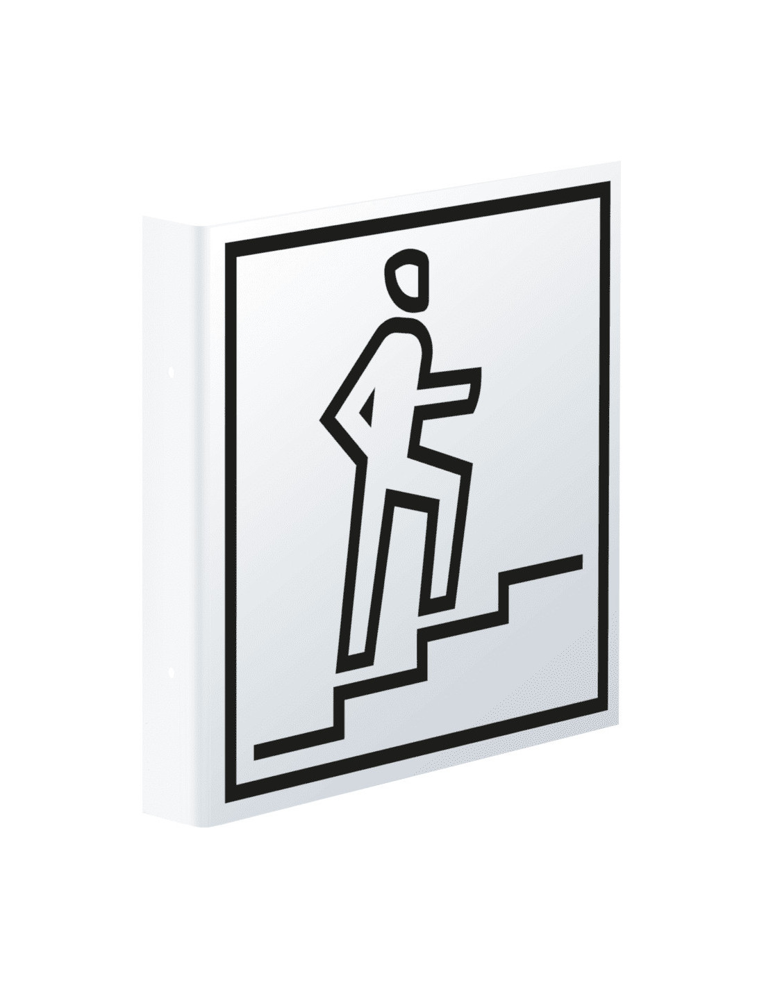 Dit haakse bord met pictogram trap omhoog is eenvoudig te monteren door de twee boorgaten van 5 millimeter. Het bord is gemaakt van kunststof. Dit maakt het bestand tegen vocht en zelfs zwakke zuren. Bovendien is het bord vlam vertragend. Hierdoor is het bord geschikt om binnen en buiten te gebruiken.