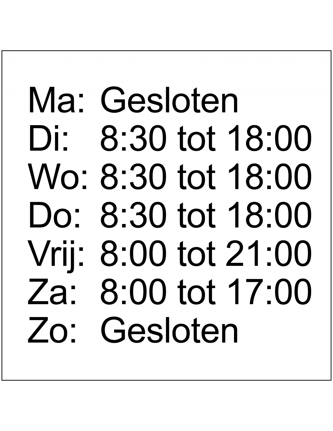 Het openingstijden bord naar wens kun je gebruiken om te laten zien wat de openingstijden van je bedrijf of organisatie zijn. Op die manier is dit voor iedereen duidelijk. Je kunt gemakkelijk je eigen openingstijden bord samenstellen met behulp van onze online live editor.