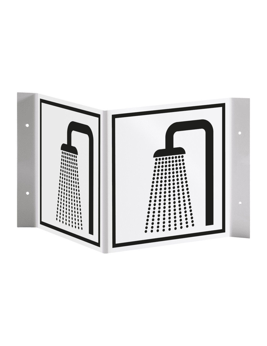 Dit panorama bord om openbare douches aan te duiden is eenvoudig te monteren door de vier boorgaten met een doorsnede van 5 millimeter. Na bevestiging is het bord vanuit een hoek van 180° te zien. Het bord is gemaakt van kunststof. Dit maakt het bestand tegen vocht en zelfs zwakke zuren. Bovendien is het bord vlam vertragend. Hierdoor is het bord geschikt om binnen en buiten te gebruiken.