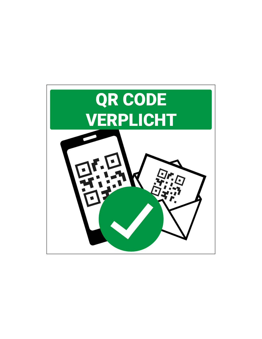 Dit QR code verplicht bord laat zien dat er voor toegang voor een bepaald event een geldige QR code verplicht is. De QR kan zowel telefonisch of als fysieke brief gescand worden. QR codes zijn vrijwel altijd uniek en zorgen voor een snelle doorloop. Bovendien zijn deze moeilijk om te vervalsen.
