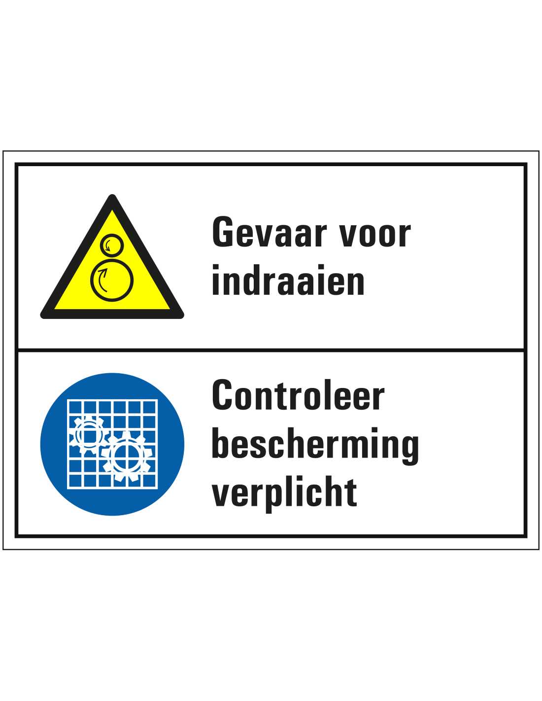 - Geeft aan dat er gevaar is voor indraaien en dat het verplicht is om de bescherming te controleren