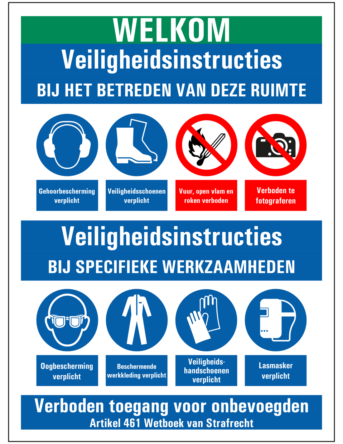 Het veiligheidsinstructies bij betreden ruimte bord gebruik je om mensen te waarschuwen voor de diverse gevaren voor het betreden van de ruimte. Daarnaast moeten werknemers die specifieke werkzaamheden uitvoeren ook nog aanvullende PBM dragen zoals een lasmasker.