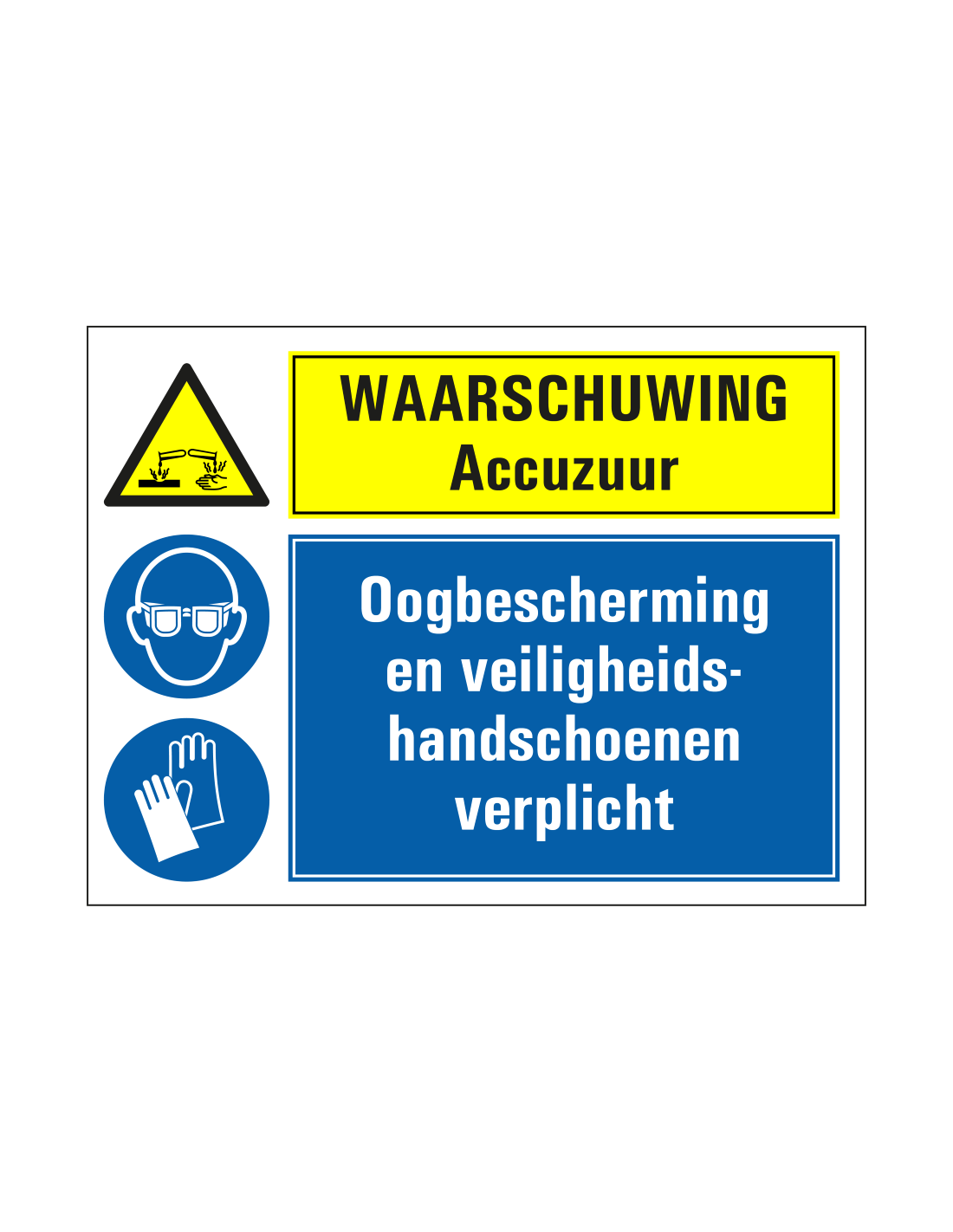 Belangrijkste kenmerken Gevaar accuzuur, oogbescherming en veiligheidshandschoenen verplicht bord