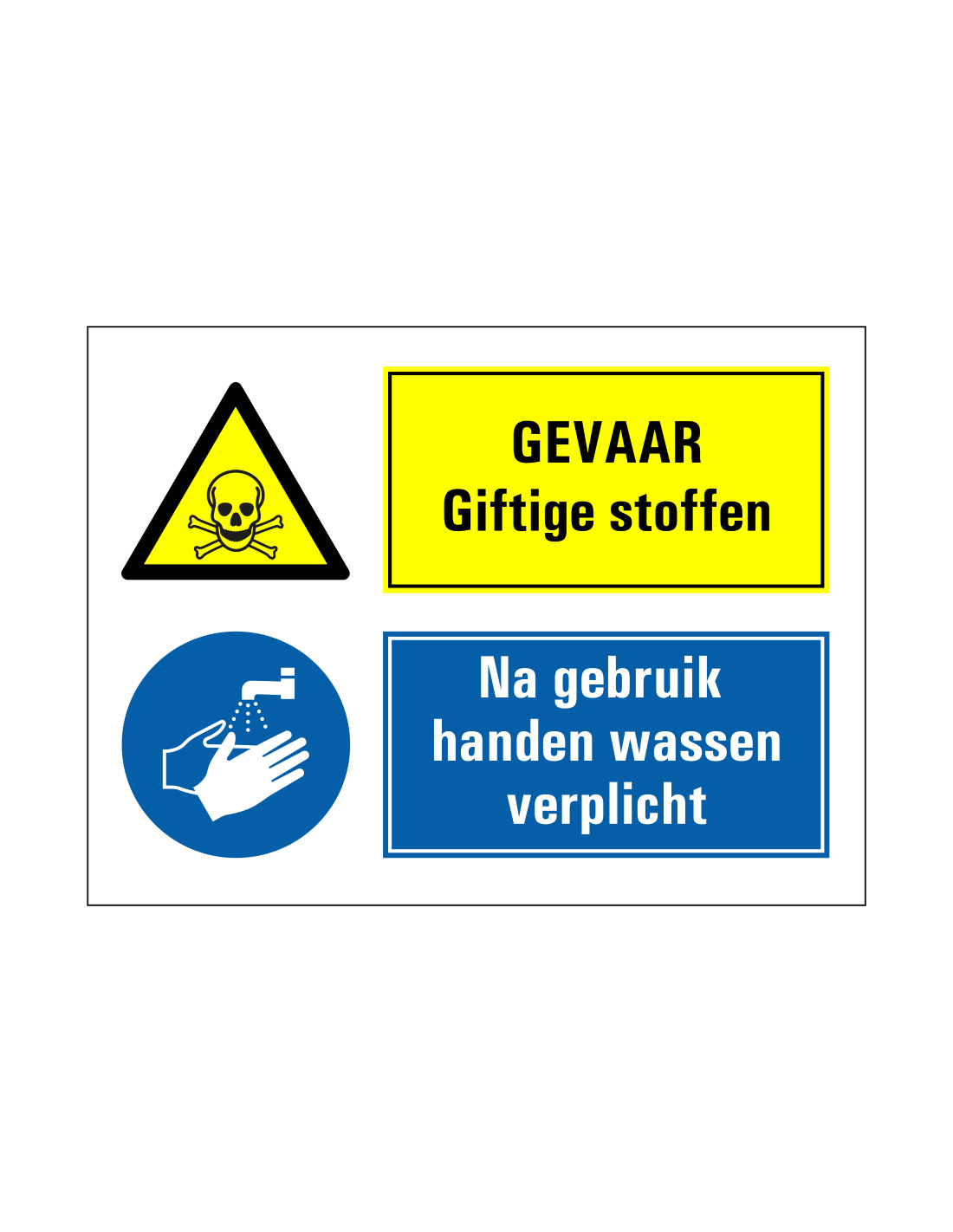 Het gevaar giftige stoffen, na gebruik handen wassen verplicht bord kun je gebruiken om aan te geven dat hier sprake is van gevaar voor giftige stoffen. Ook geeft het bord aan dat handen wassen verplicht is na gebruik.