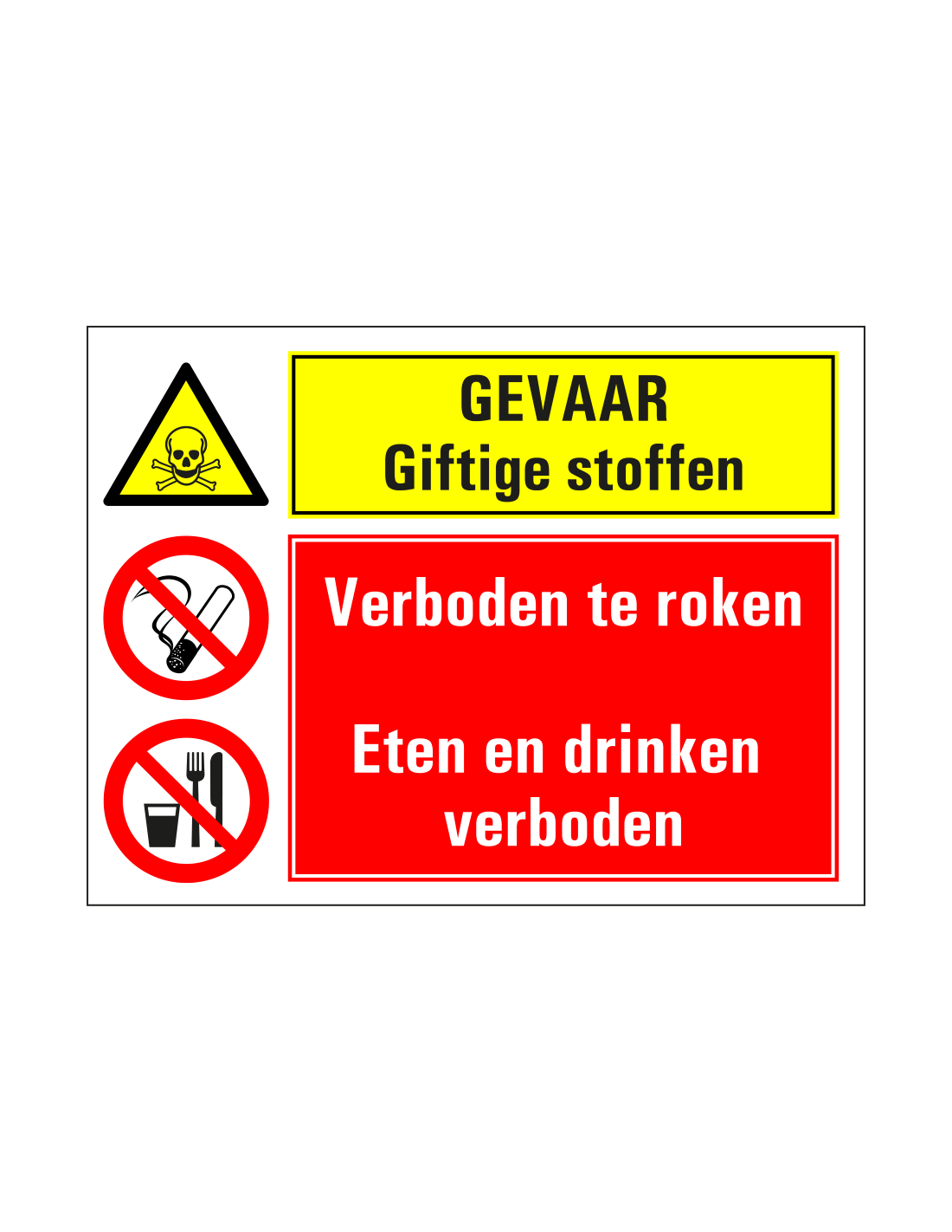 Het gevaar giftige stoffen, roken eten en drinken verboden bord kun je gebruiken om aan te geven dat hier sprake is van gevaar voor giftige stoffen. Ook geeft het bord aan dat roken, eten en drinken hier verboden is.