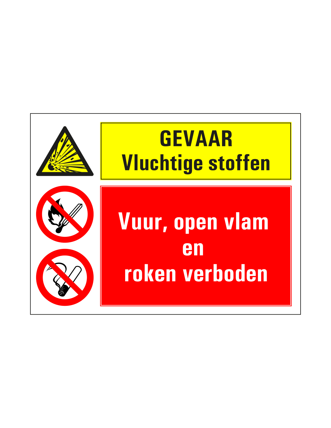 Het gevaar vluchtige stoffen, vuur open vlam en roken verboden bord kun je gebruiken om aan te geven dat hier sprake is van gevaar voor vluchtige stoffen. Ook geeft het bord aan dat vuur, open vlam en roken hier verboden is.