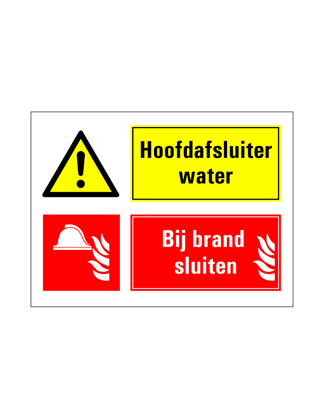 Het Hoofdafsluiter water afsluiten bij brand bord kun je gebruiken om aan te geven dat hier een hoofdafsluiter water beschikbaar is. Daarnaast geeft het bord aan dat deze bij brand gesloten moet worden.
