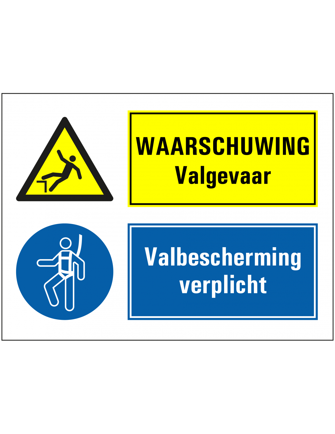 Het valgevaar, valbescherming verplicht bord kun je gebruiken om te waarschuwen voor valgevaar op deze plek. Daarnaast geeft het bord aan dat valbescherming op deze plek verplicht is.