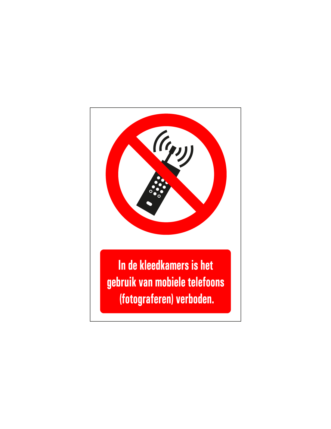 Het bord met afbeelding en tekst mobiel fotograferen in kleedkamer verboden geeft aan dat het op deze locatie verboden is om met een mobiel apparaat te fotograferen in de kleedkamer.