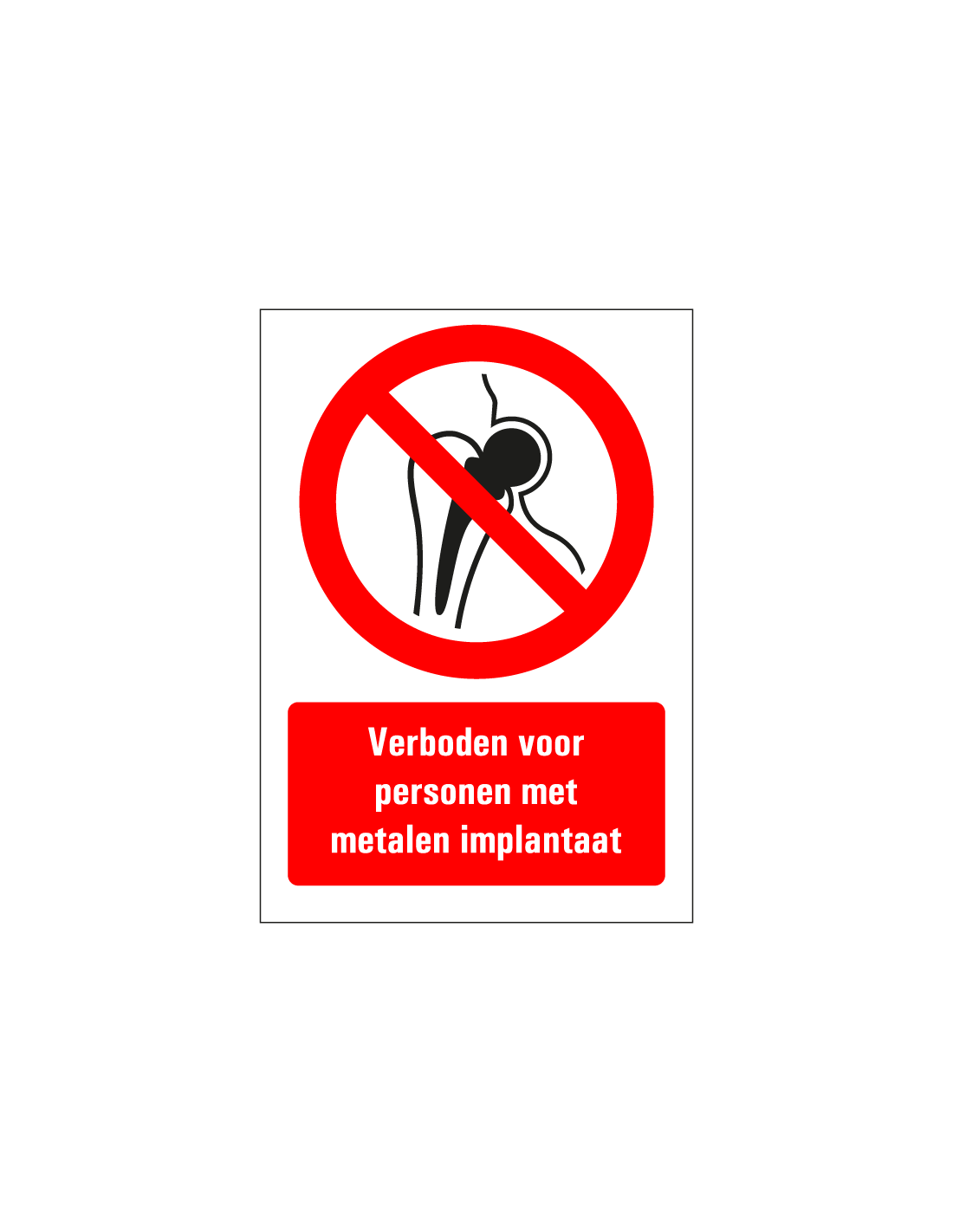 Het bord met afbeelding en tekst verboden voor personen met metalen implantaat geeft aan dat het op deze locatie verboden is om de ruimte te betreden voor mensen met een metalen implantaat.