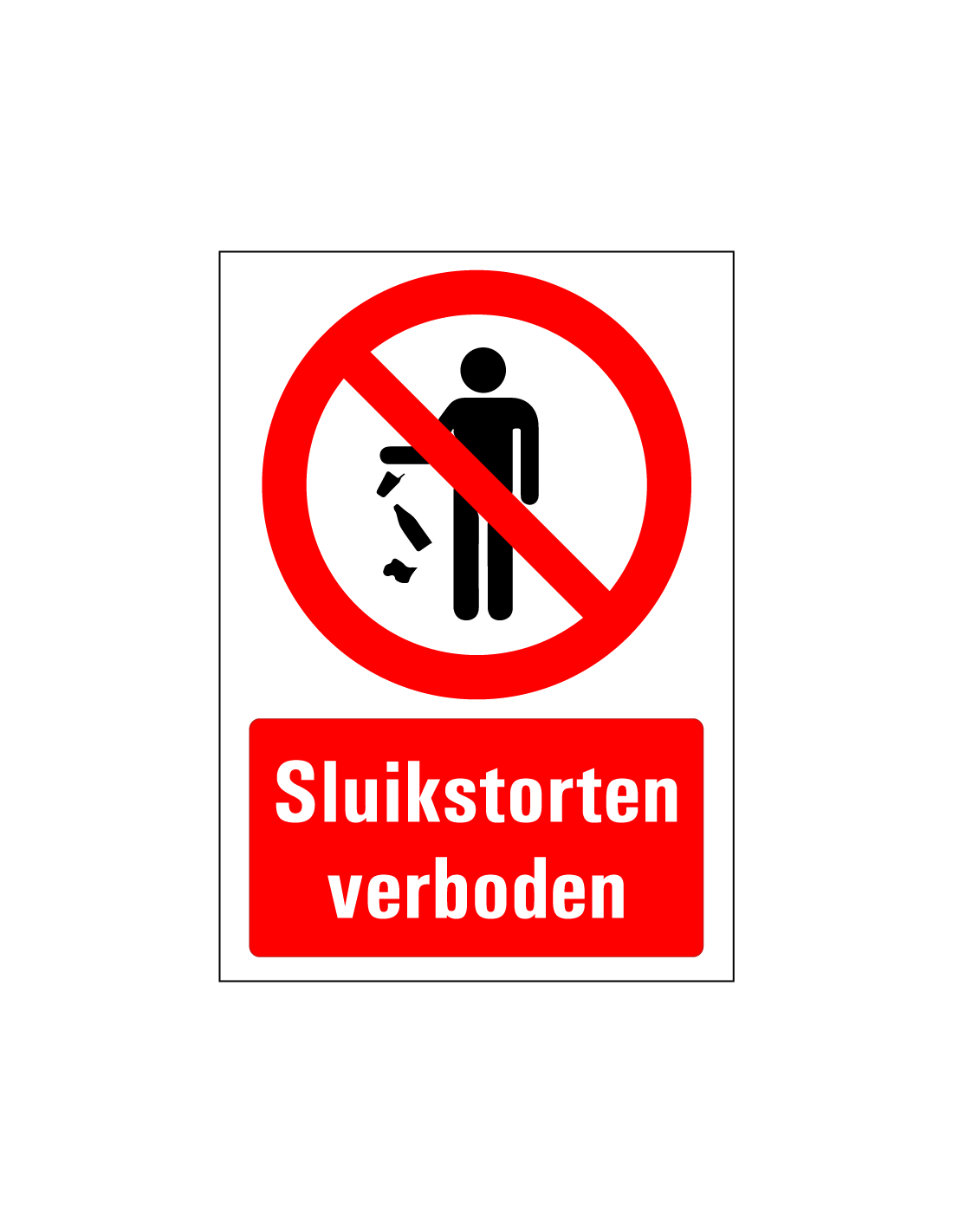 Het Sluikstorten verboden bord is een rechthoekig bord met het symbool van een persoon die iets weggooit om aan te geven dat er hier sprake is van een verbod op zwerfafval. Het bord is voorzien van de Nederlandse tekst "Sluikstorten verboden" in witte letters op een rode achtergrond. Het bord is verkrijgbaar in verschillende afmetingen en is geschikt voor binnen- en buitengebruik.