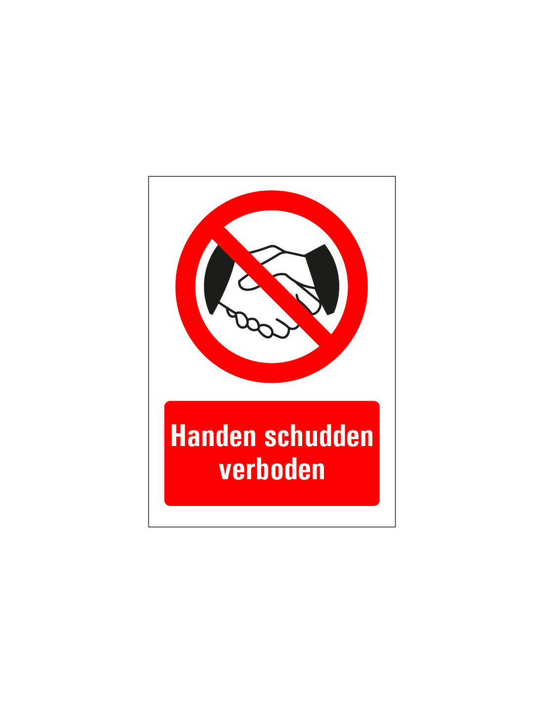 Het bord met tekst handen schudden verboden geeft aan waar niet handen geschud mag worden. De Nederlandse tekst maakt het nog wat duidelijker wat het pictogram inhoudt. Dit voorkomt tevens minsverstanden. De sticker is verkrijgbaar in meerdere A-formaten en is gemaakt van polystyreen.