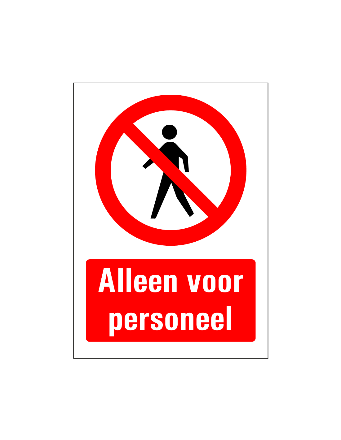 Het Alleen personeel bord is een rechthoekig bord met een verbodssymbool om aan te geven dat er hier sprake is van een plek waar alleen personeel mag komen. Het bord is voorzien van de Nederlandse tekst "Alleen voor personeel" in witte letters op een rode achtergrond. Het bord is verkrijgbaar in verschillende afmetingen en is geschikt voor binnen- en buitengebruik.