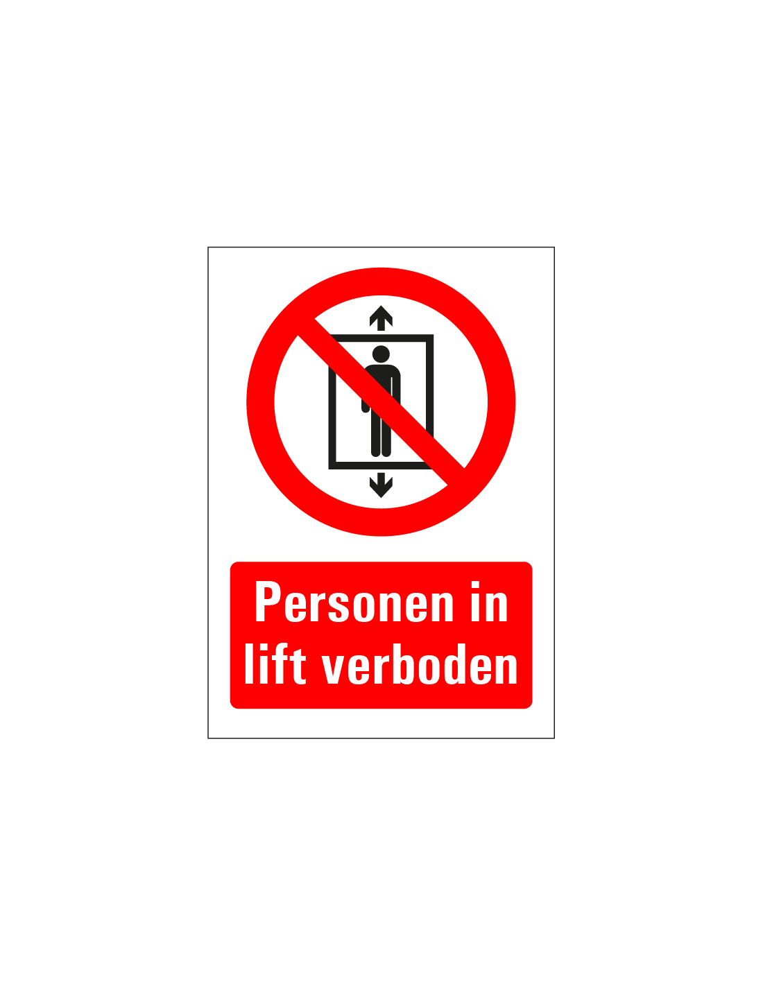 Het bord met tekst personen in lift verboden geeft aan dat het niet de bedoeling is, om als mensen, de lift te gebruiken. De Nederlandse tekst maakt het nog wat duidelijker wat het pictogram inhoudt. Dit voorkomt tevens minsverstanden. De sticker is verkrijgbaar in meerdere A-formaten en is gemaakt van polystyreen.