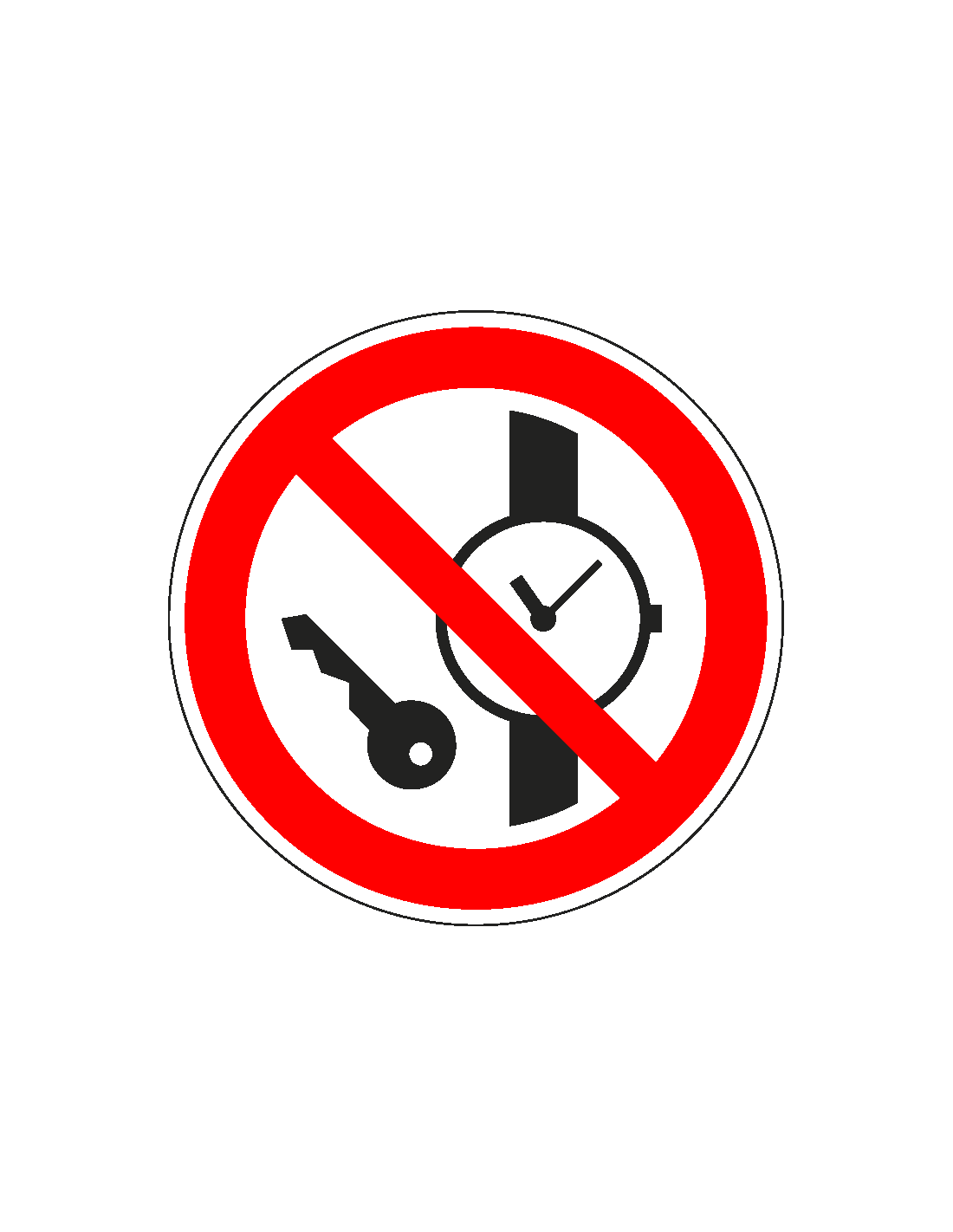 Dit bord laat door een afbeelding met kleine metalen voorwerpen zien dat er sprake is van een verbod op kleine metalen voorwerpen. Dit is bijvoorbeeld handig voor de douane op een luchthaven, omdat deze voorwerpen daar vaak niet zijn toegestaan.