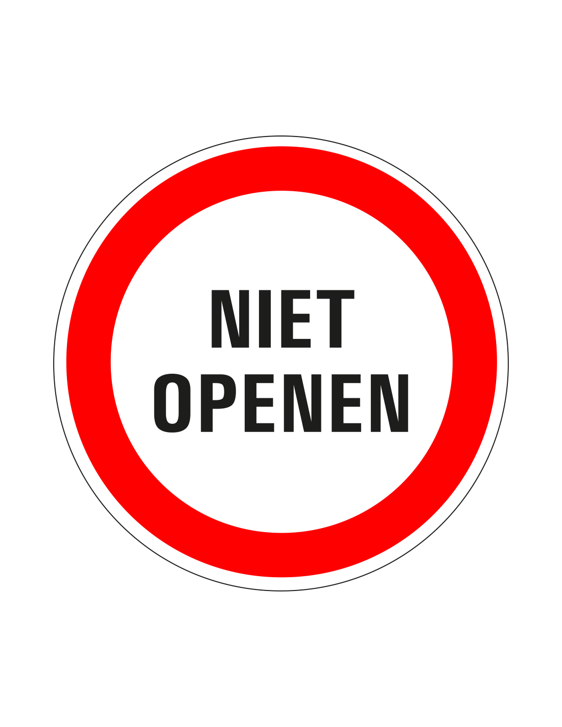 Het Niet openen bord is een rond bord met tekst om aan te geven dat je iets niet mag openen. Het bord is voorzien van de Nederlandse tekst "Niet openen" in zwarte letters op een witte achtergrond. Het bord is verkrijgbaar in verschillende afmetingen en is geschikt voor binnen- en buitengebruik.
