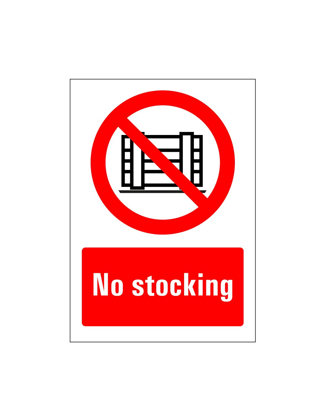 Het no stocking bord is een rechthoekig bord met een verbodssymbool om aan te geven dat het neerzetten van goederen hier verboden is. Het bord is voorzien van de Engelse tekst "No stocking" in witte letters op een rode achtergrond. Het bord is verkrijgbaar in verschillende afmetingen en is geschikt voor binnen- en buitengebruik.