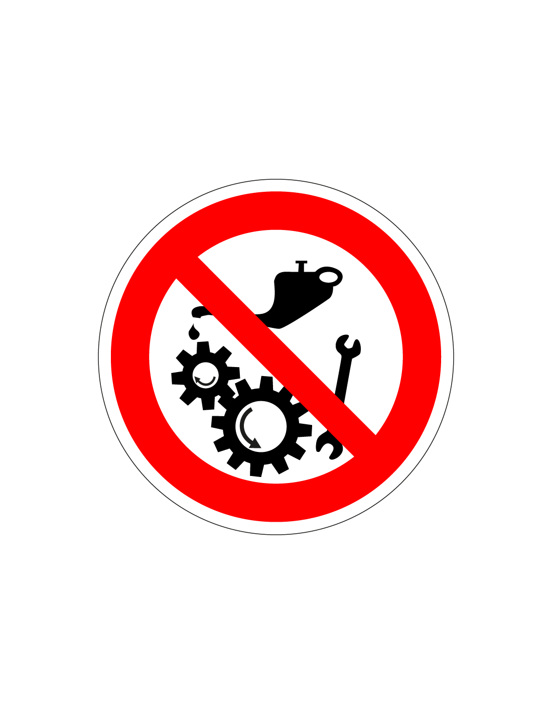 Dit bord laat door middel van diverse pictogrammen zijn dat smeren of reinigen terwijl de machine aanstaat verboden is. Deze verbodsbord zorgt ervoor dat mensen erop worden geattendeerd om niet te smeren terwijl de machine aanstaat waardoor mogelijke schade aan de machine voorkomen wordt.