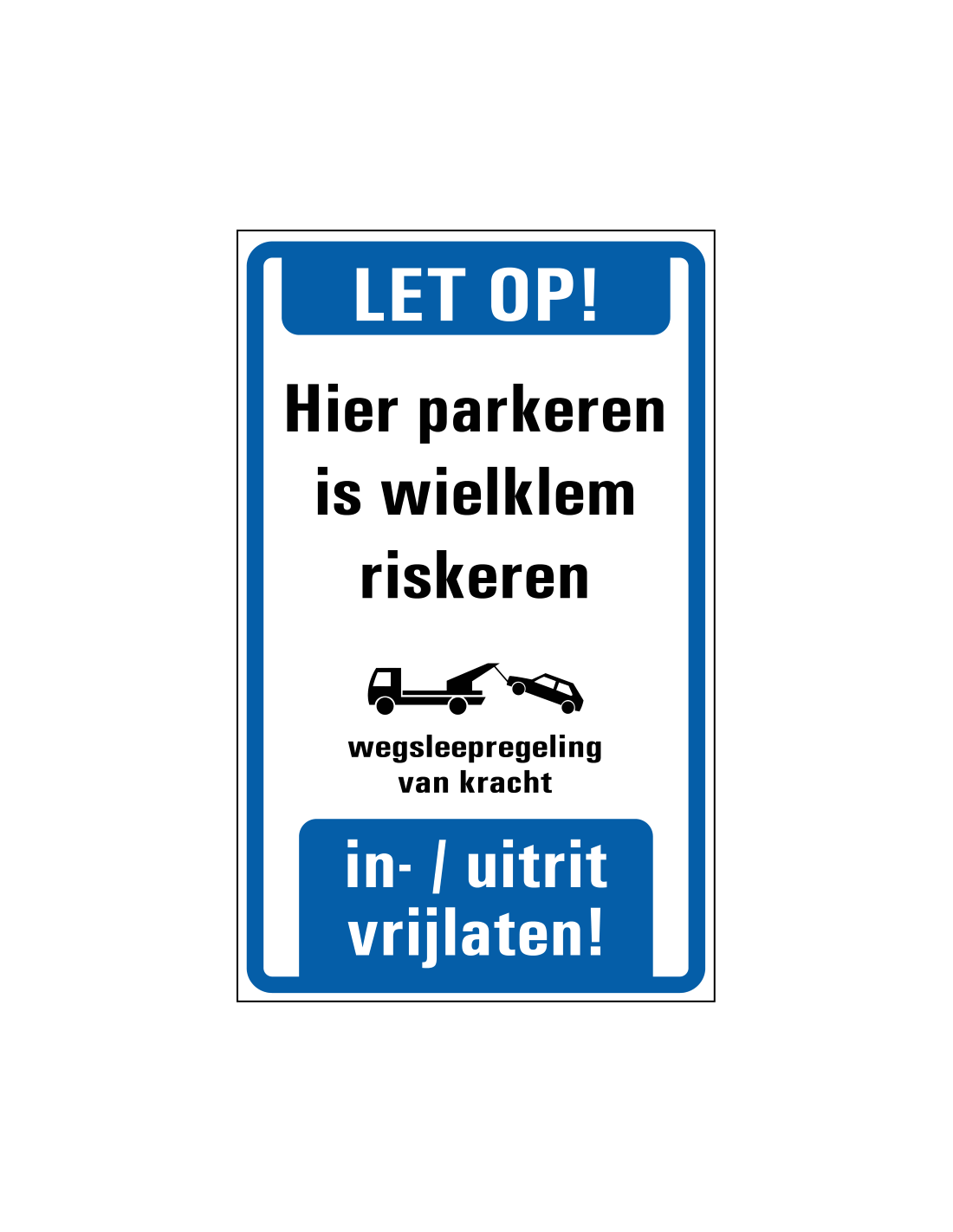 Dit "Hier parkeren is wielklem riskeren" bord is ontworpen om op een duidelijke manier aan te geven dat parkeren op deze locatie risico op wegslepen met een wielklem met zich meebrengt. Het bord is vervaardigd uit hoogwaardig kunststof, waardoor het geschikt is voor zowel binnen- als buitengebruik. De rechthoekige vorm, gecombineerd met het wegsleepregeling symbool en Nederlandse tekst, zorgt voor een heldere boodschap naar de bezoekers toe.