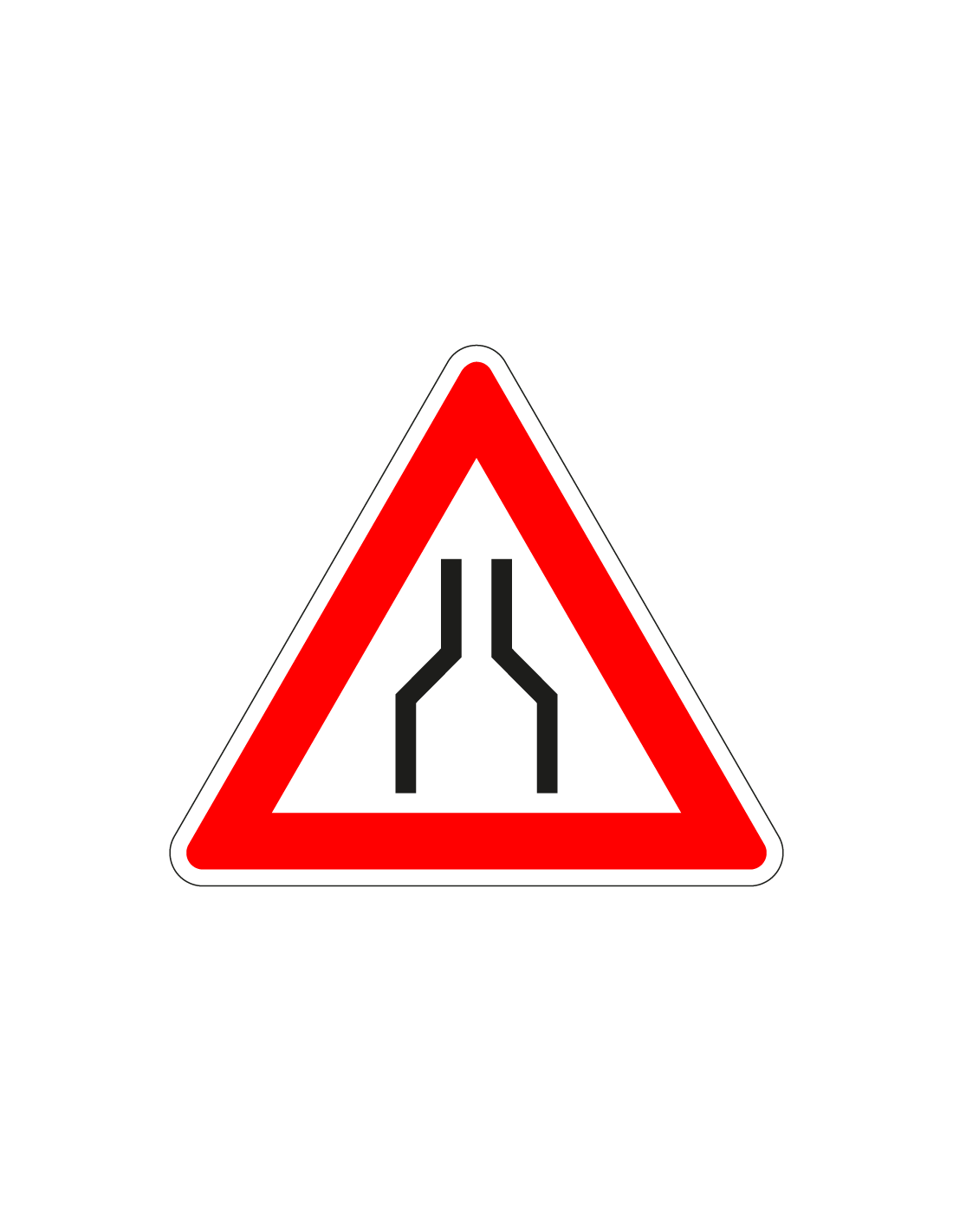 Dit wegversmalling bord laat zien dat mensen een wegversmalling naderen op deze weg. Door hiervoor te waarschuwen, zorgt u ervoor dat mensen hun snelheid minderen.